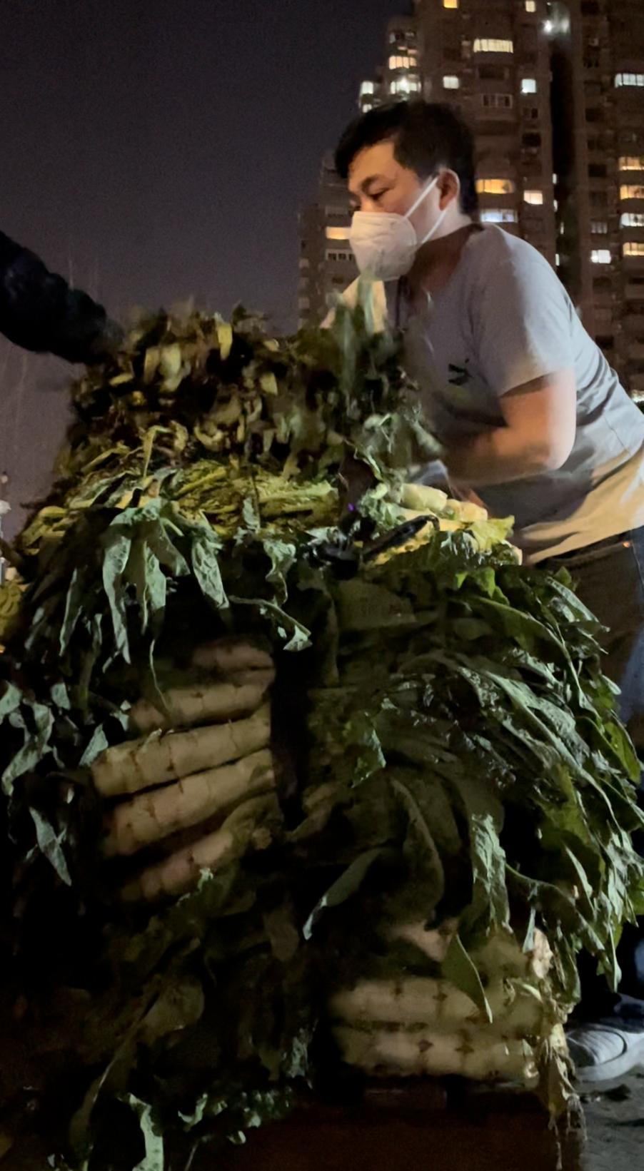 “青菜、生菜、油麦菜等绿叶菜最为紧俏,长时高温很容易就蔫了。”巨鹿青年突击队队长介绍。如何让居民吃上新鲜的蔬菜?突击队队员们想出了各种奇思妙招。深夜0:25,仓库灯火通明,地板上分门别类地堆放蔬菜,冷风机和通风机在两侧强劲地鼓风。突击队队员和淮海集团的志愿者每5个人分成一个小组流水作业:卸车、清洗、包装、扎袋等工作有条不紊。