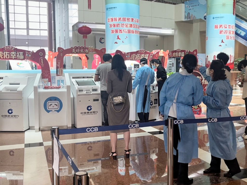 建行上海浦东分行营业部负责人汪菁告诉记者,自封控以来,今天是该网点对外营业的第一天。但作为已在网点闭环值守了两月余的汪菁来说,人隔离,业务却没停下过,“封控期间,我们承担了浦东地区48家网点的主要业务,一些紧急、必要的如放款、资金清算、证券资金划转、外汇资金结算等都没有停下过。”