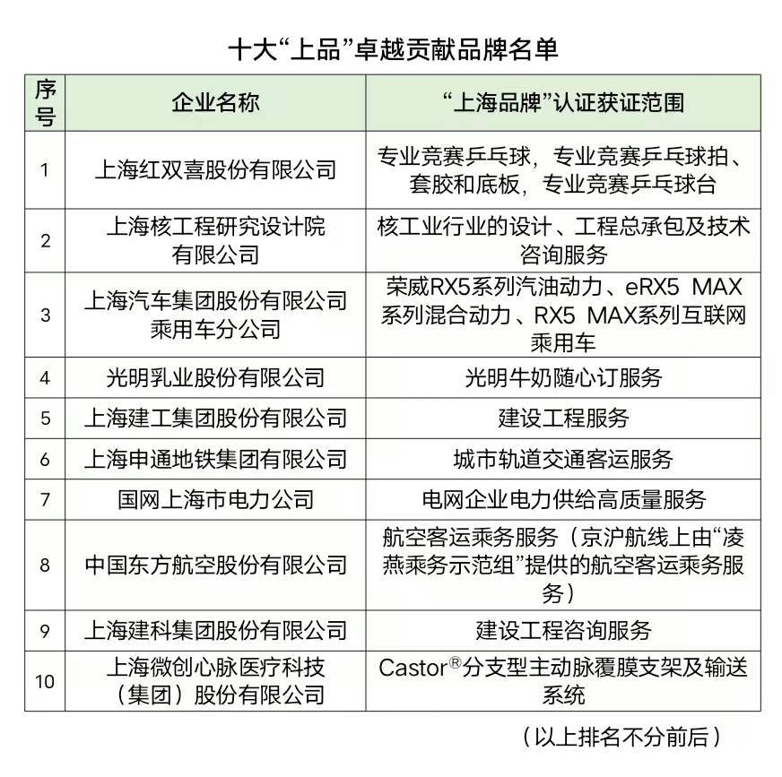 6月9日,上海市市场监管局还同时发布了第五批通过“上海品牌”认证的25家企业25项产品和服务,公布了“十大‘上品’卓越贡献品牌”评选结果。