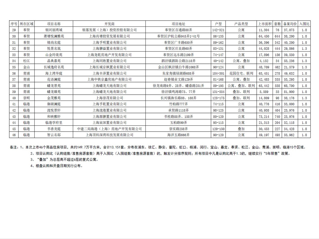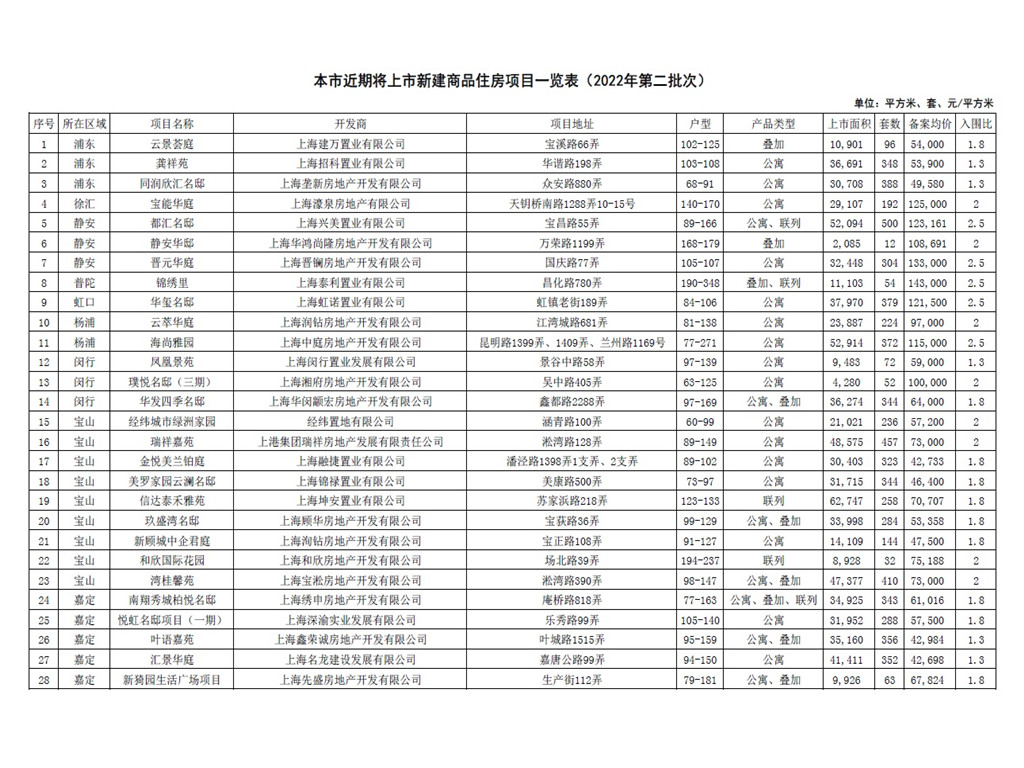 2022年,本市第二次以集中批量供应的方式推出房源。该批房源共涉及46个项目,总建筑面积约149.7万平方米,共计13,151套,备案均价58558元/平方米,分布在浦东、徐汇、静安、普陀、虹口、杨浦、闵行、宝山、嘉定、奉贤、松江、金山、青浦、崇明、临港15个区域。