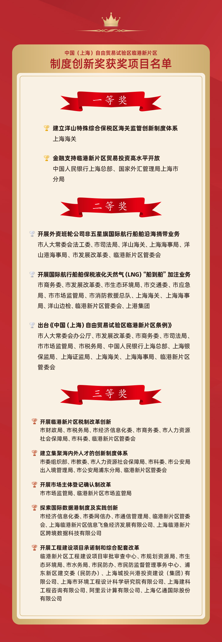 大会上,在全市各单位、各部门申报的64个制度创新项目中,选出了“建立洋山特殊综合保税区海关监管创新制度体系”等10个具有首创性、引领性、标杆性的制度创新实践项目,授予了“临港新片区制度创新奖”。此次大会表彰的十大制度创新项目,覆盖“五自由一便利”、法治、税制、“放管服”改革等多个领域,体现了中央和国家相关部门、全市上下对临港新片区的大力支持,彰显了临港新片区成立三年来对外开放和制度创新的成绩和亮点。