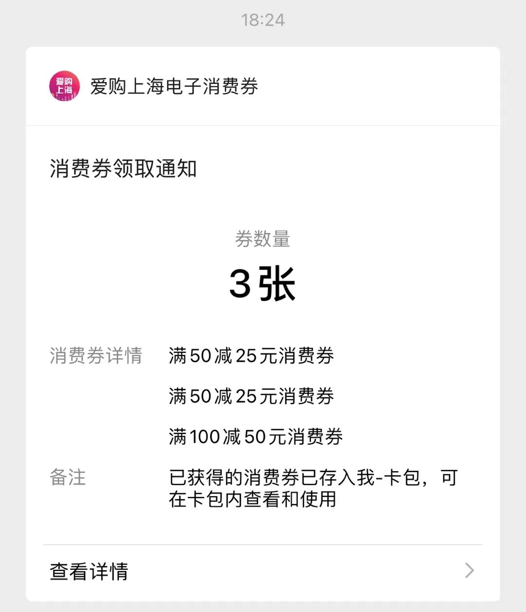 “为各种摇号开了个好头。”8月25日傍晚18时32分,市民李先生在朋友圈晒出了其通过微信支付平台参与本轮消费券申领的结果,显示他一共中了3张券,已存入其微信支付平台的“我-卡包”。这3张券分别为2张满50元减25元的消费券,和1张满100元减50元的消费券。为此,李先生表示,他优先考虑用消费券来购买“好吃的”。