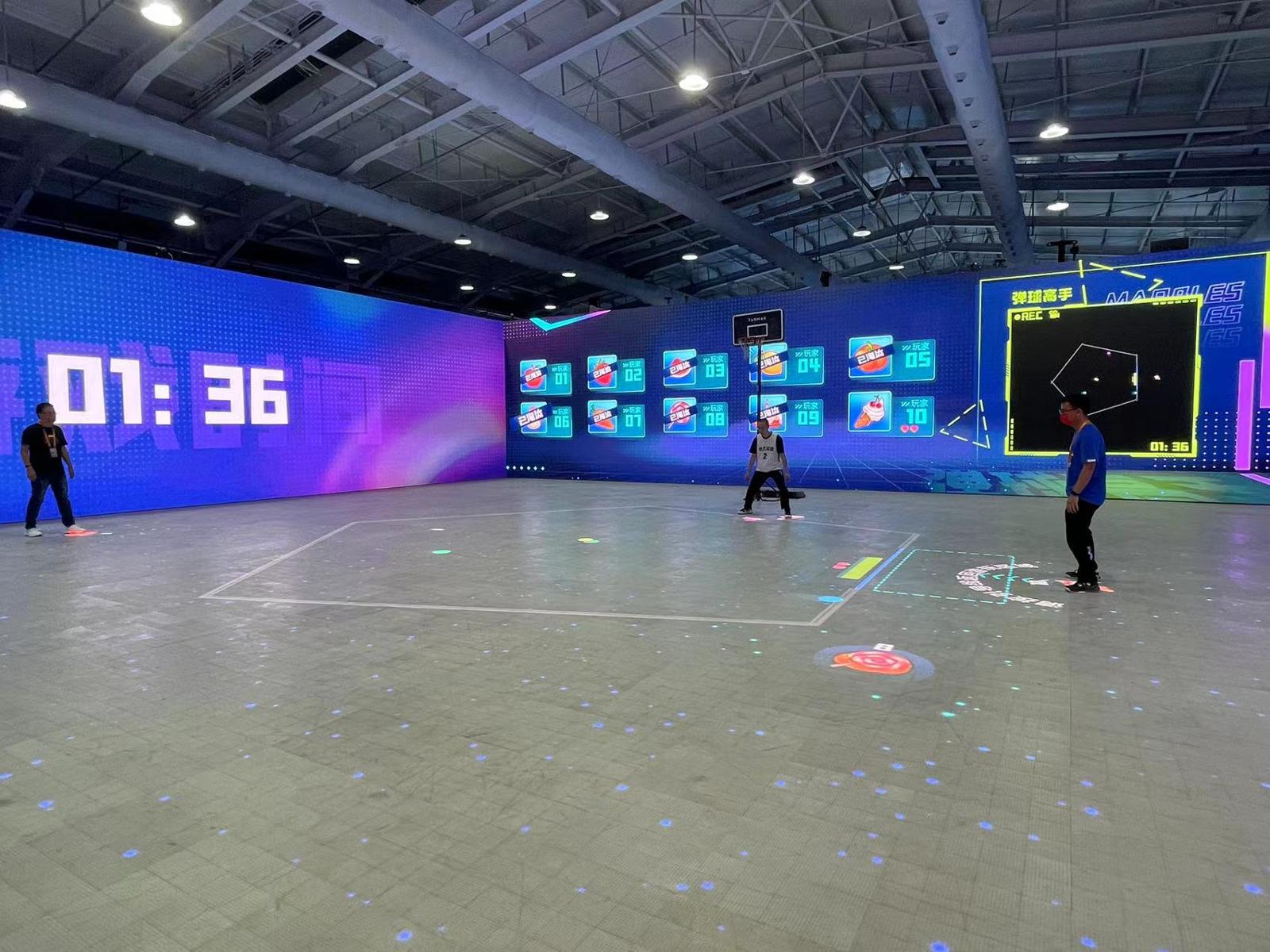 场馆另一边,几十名现场观众正围着一场3V3篮球赛看得起劲儿。和普通的篮球赛场地不同,这是个应用大规模人机交互系统的“游戏大宇宙”。场地里不仅能够实时显示出比赛分数,还能对运动员的犯规动作做出裁判。通过系统的精准记录和捕捉,比赛结束之后,每名运动员都能从中找到自己的“精彩瞬间”,现场回顾后还可永久留存。