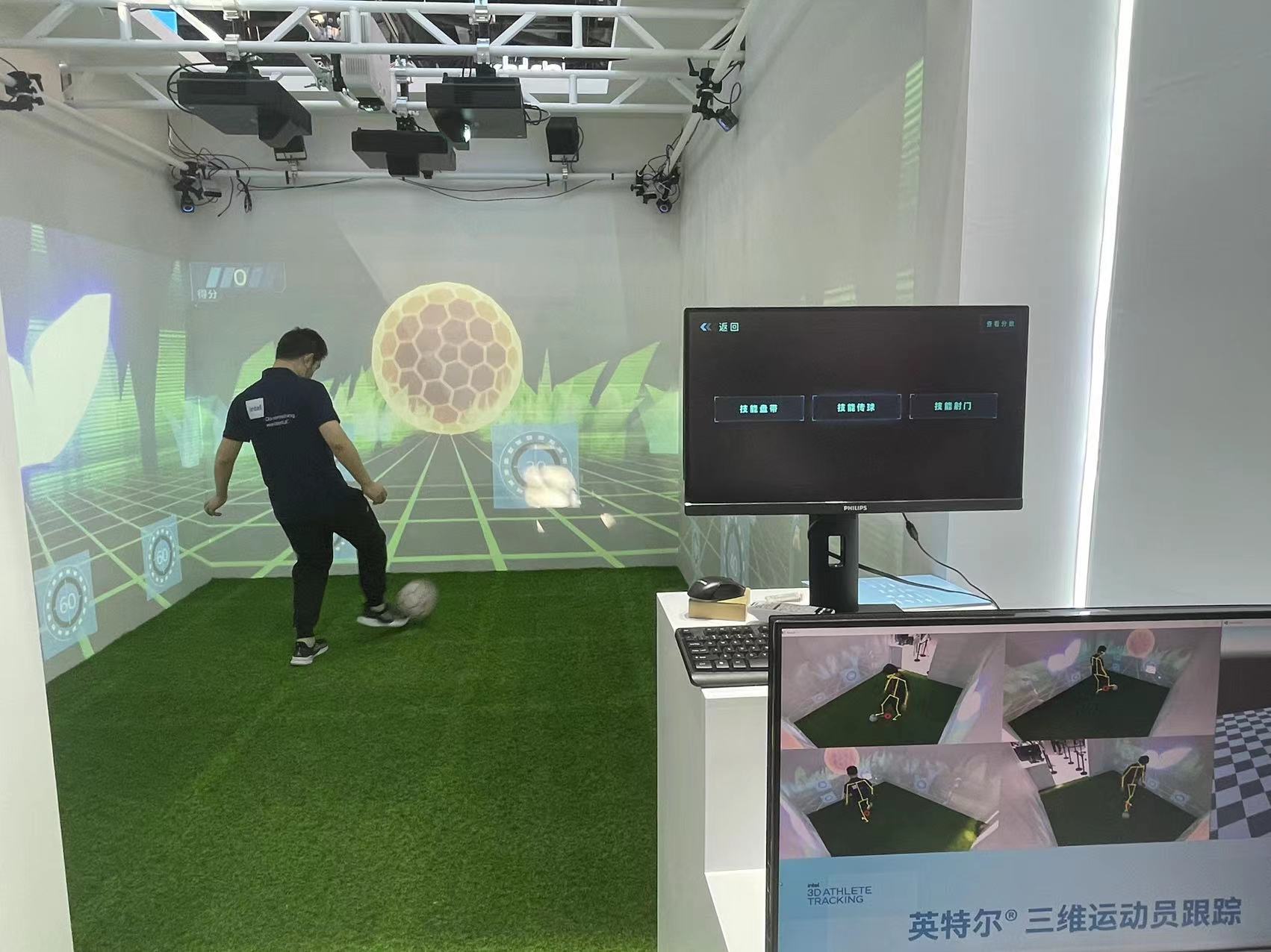 “恭喜!已完成技能射门。”英特尔展台一间模拟足球场的小屋里,工作人员将足球踢向墙面。球刚落地,动作解析随之完成,运动情况得分也呈现在大屏幕上——这是英特尔在今年服贸会上展示的3DAT技术。
