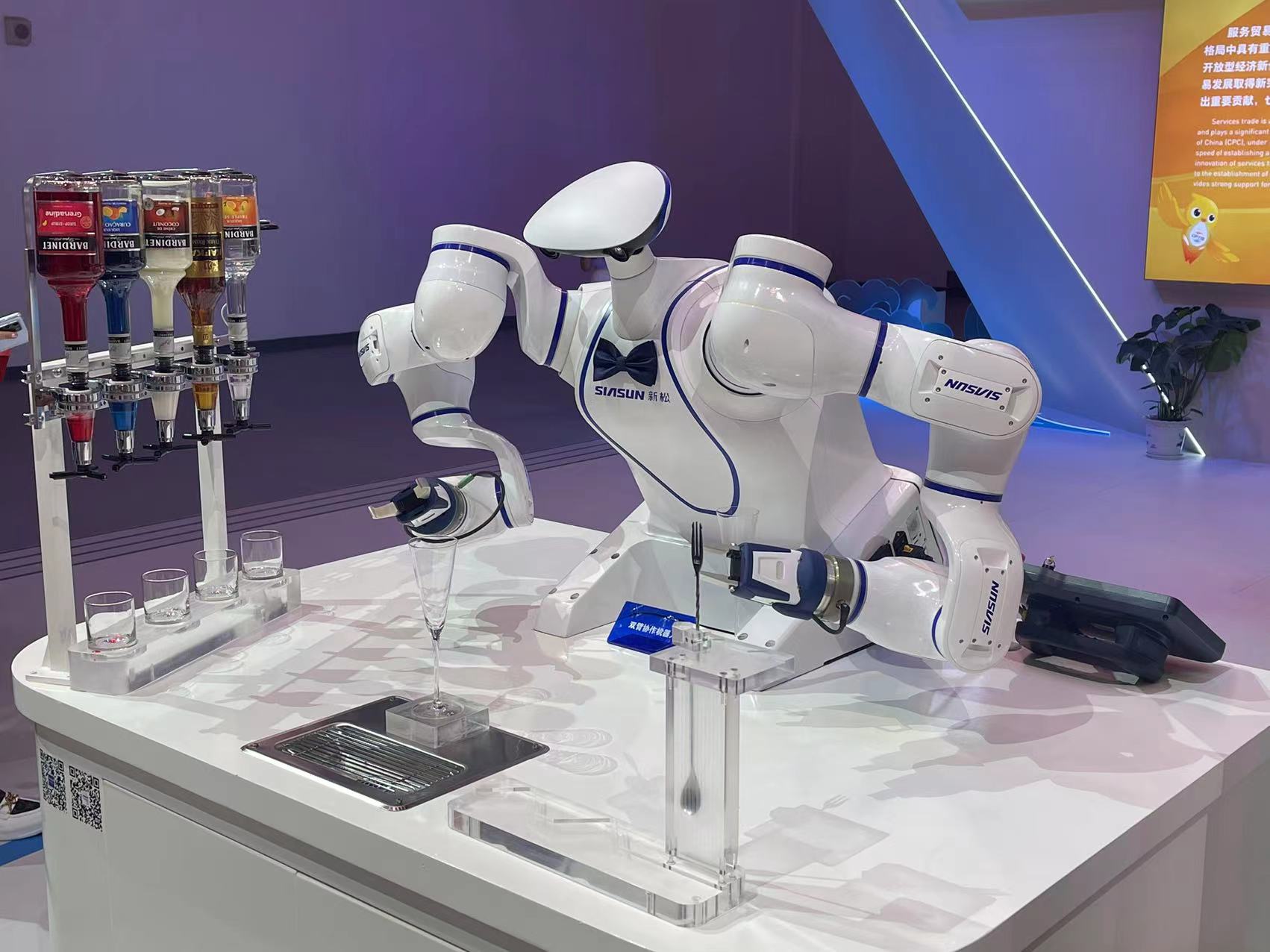 在成就展展区,一台调酒机器人引起围观。只见这位来自新松的机器人“调酒师”轻巧灵活地转动着机械手臂,模仿人类专业调酒师,完成鸡尾酒分层调制这种高难度的专业操作。“这是我国首台七轴双臂协作式机器人,拥有完全自主知识产权。在调酒过程中,机器人可以完成取杯、取酒、引流、倒酒等一系列动作,调完酒后还可以把酒杯放在指定区域。”新松现场工作人员介绍。