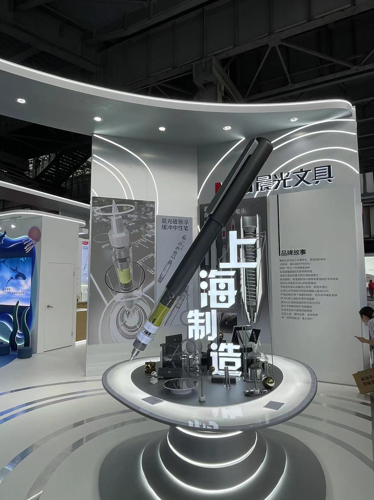 来到晨光展台,被放大数倍的磁悬浮中性笔装置已提前锁定展台“C位”。据晨光品牌部高级经理郑天慧介绍,磁悬浮中性笔,是在笔握处加入磁力缓冲装置,运用"同极相斥"的原理,从而缓解书写压力并保护笔头,这款产品去年已获得德国iF设计奖。