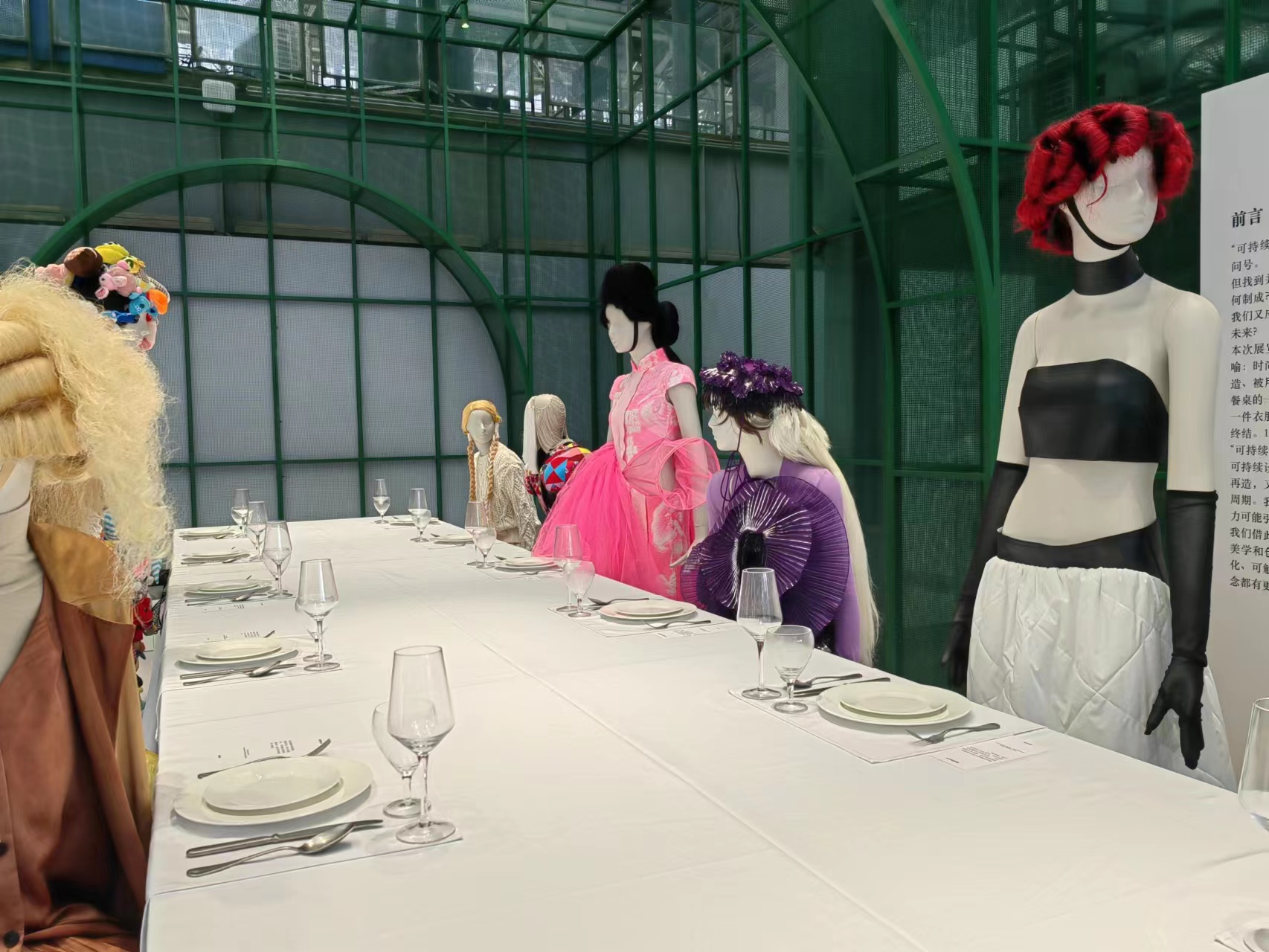 在可持续时尚区,一位头顶多个玩偶做成的帽子的模特吸引了记者的目光,在它的周围还有11位造型各异的模特或是穿着礼服、或是休闲打扮,顶着夸张的发型环绕在一张餐桌旁。
