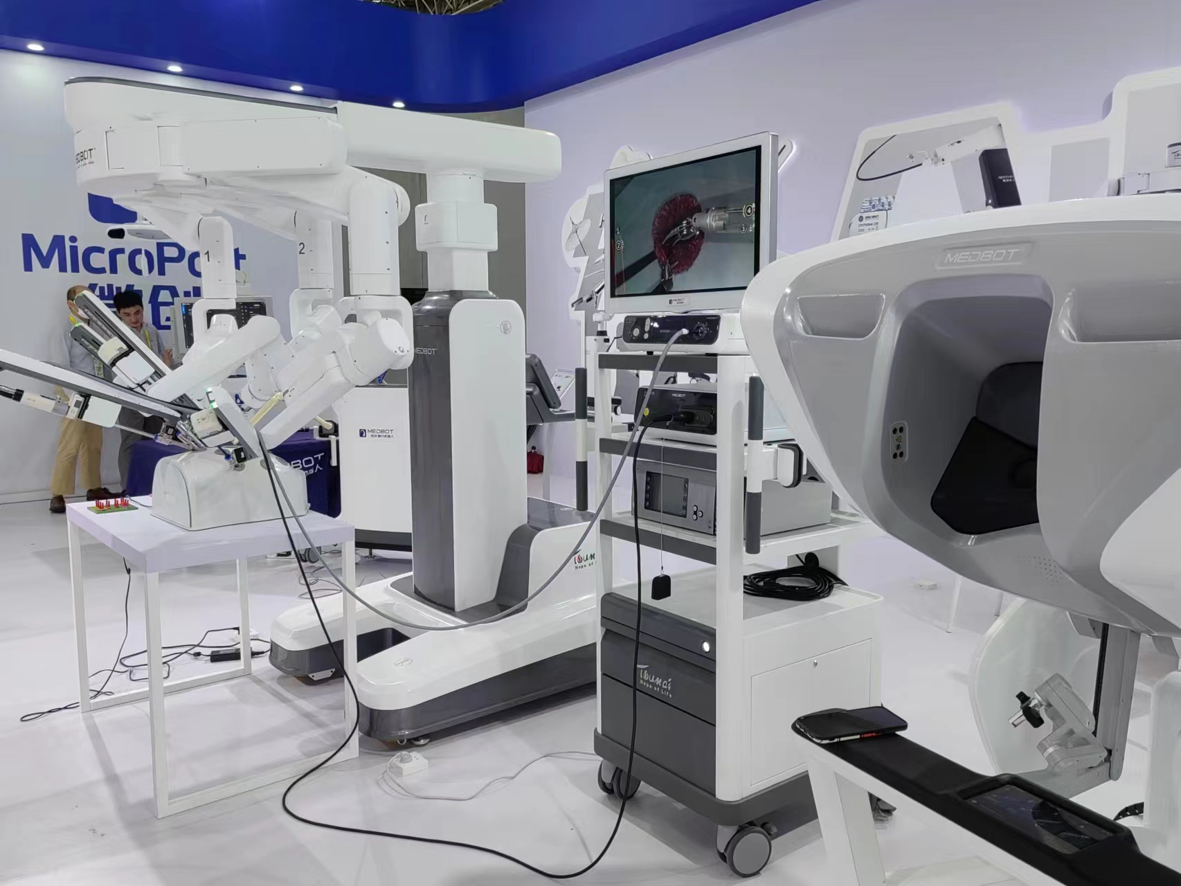 设计不仅存在于五颜六色、款式各异的服装上,也体现在一台灰色和白色交相辉映的“三头六臂”的大家伙上。这台由医生控制台、患者手术平台和图像平台组成的图迈腔镜手术机器人,占据了上海微创医疗机器人(集团)股份有限公司展台近一半的面积,培训师正操控着四条机械臂拆解一朵鲜花,刚与柔的碰撞引来了不少探营者围观。