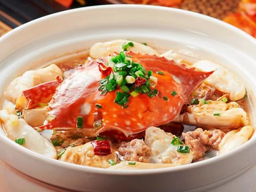 当季的梭子蟹也已开始送上餐桌。上海德兴馆把梭子蟹和目鱼蛋一起蒸制,两种海鲜的叠加简直要让人“鲜掉眉毛”。最特别的是,这道“目鱼蛋糟蒸梭子蟹”里的糟字指的却不是常见的糟卤,而是他们自制的糟排骨,其糟味来源于德兴馆传承了几代的老配方加以改良,当糟香四溢的排骨和目鱼蛋、梭子蟹一同历经高温蒸制时,糟香味与鲜味互相融合,让人从这道老菜里品出了不一样的新味道。