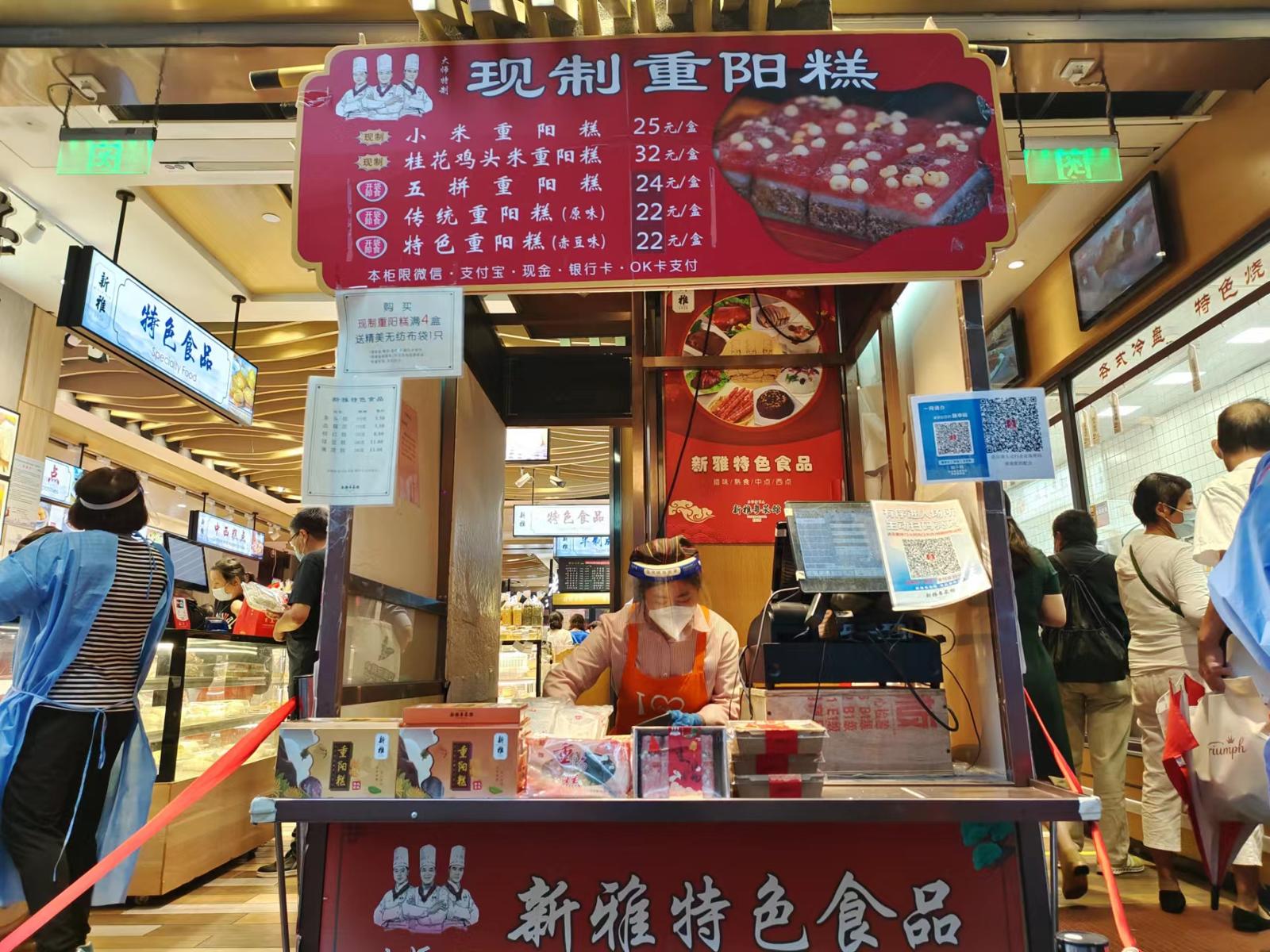 而在南京路上的第一食品里,老字号沈大成、青浦乔家栅等品牌的重阳糕也在热销。沈大成的一款现制现售的果仁重阳糕颇受关注,绿豆糕、玫瑰糕、赤豆糕、条头糕、蔓越梅豆糕、松仁米糕等糕点也很受欢迎。青浦乔家栅柜面里,一大、一小不同包装的重阳糕售价并不高,松糕、小米糕、血糯米糕、定胜糕等糕点也在同柜搭售。