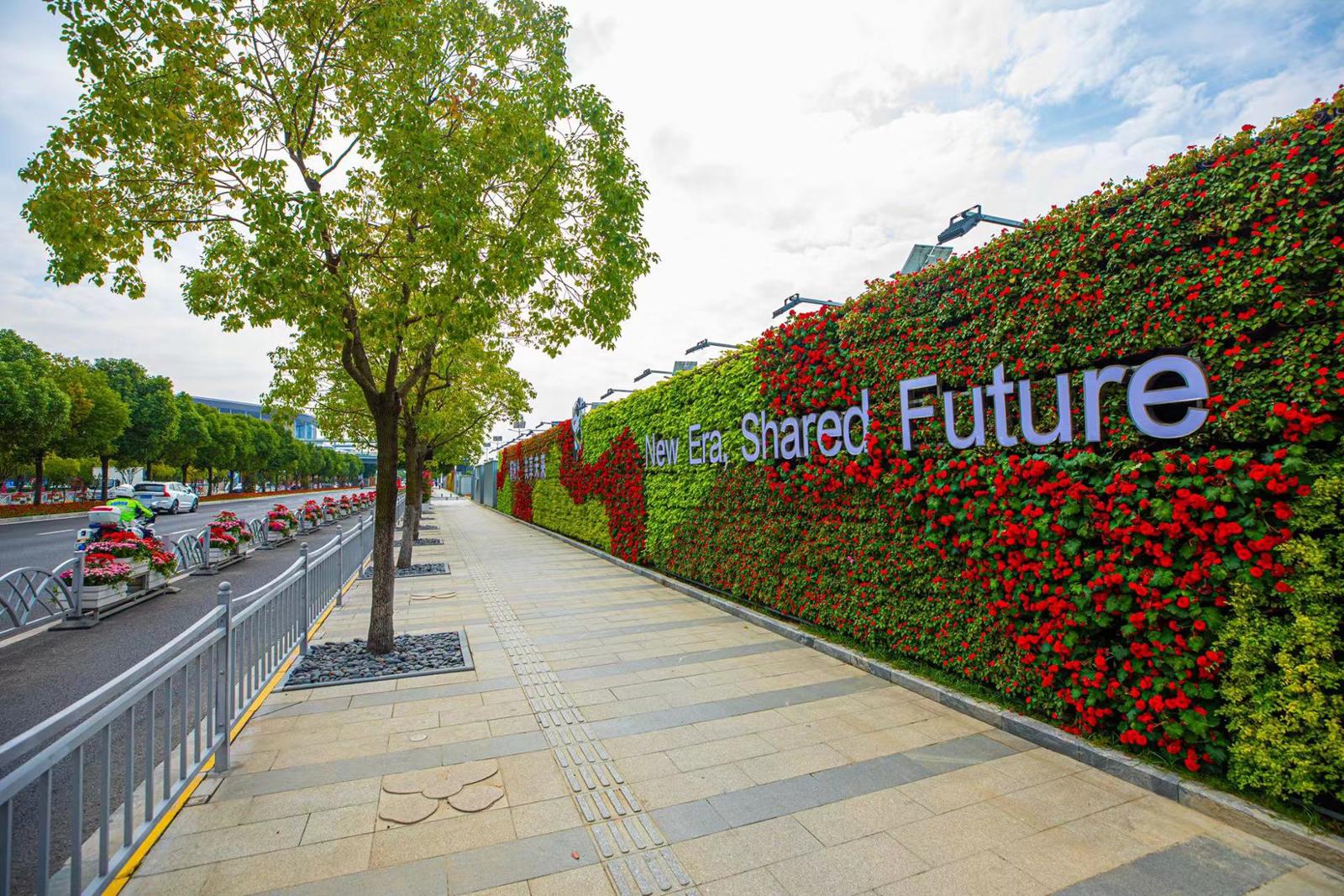 步入进博会核心区,可以看到“四叶草”已经置身于缤纷花海之中。各色花箱、花卉、花墙、花景映入眼帘,为进博会再添一抹亮色。
