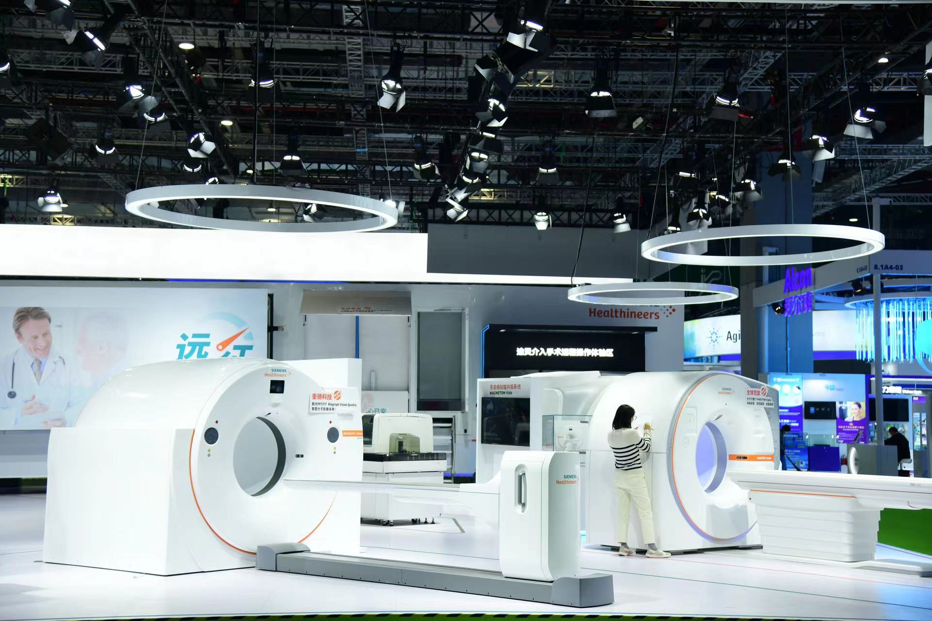 8.1馆这个“诊疗室”则聚集了佳能医疗、西门子医疗、美敦力等世界知名的医疗设备研发和制造企业,不少企业都带来了中国乃至全球首发的产品。一走进展馆就能看到几家展台上都有被防尘罩遮盖着的“神秘宝藏”,从轮廓能看出有CT和“三头六臂”的手术机器人,等待正式开幕与观众见面。