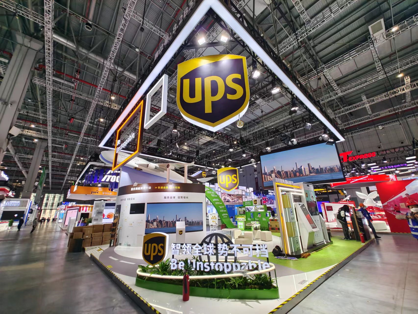 在进博会现场,UPS展台以飞机飞行轨迹为设计灵感,顶部悬挂环保玻璃钢材质的UPS自有飞机模型,地面模拟飞机起飞跑道和草地,寓意UPS时刻为中国企业高效连接全球市场做好准备。今年,UPS也展示了其创新智慧物流方案,观众可直接体验随时随地、随心所寄的UPS微信寄件服务。并现场带来供应链诊断与优化解决方案。