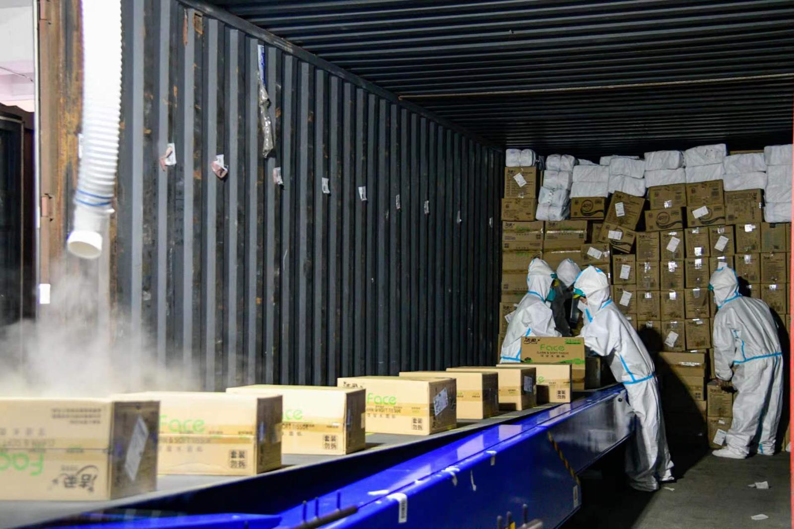 (图说:在中高风险地区邮件专用通道,上海邮政工作人员身穿防护服对邮件消毒。)