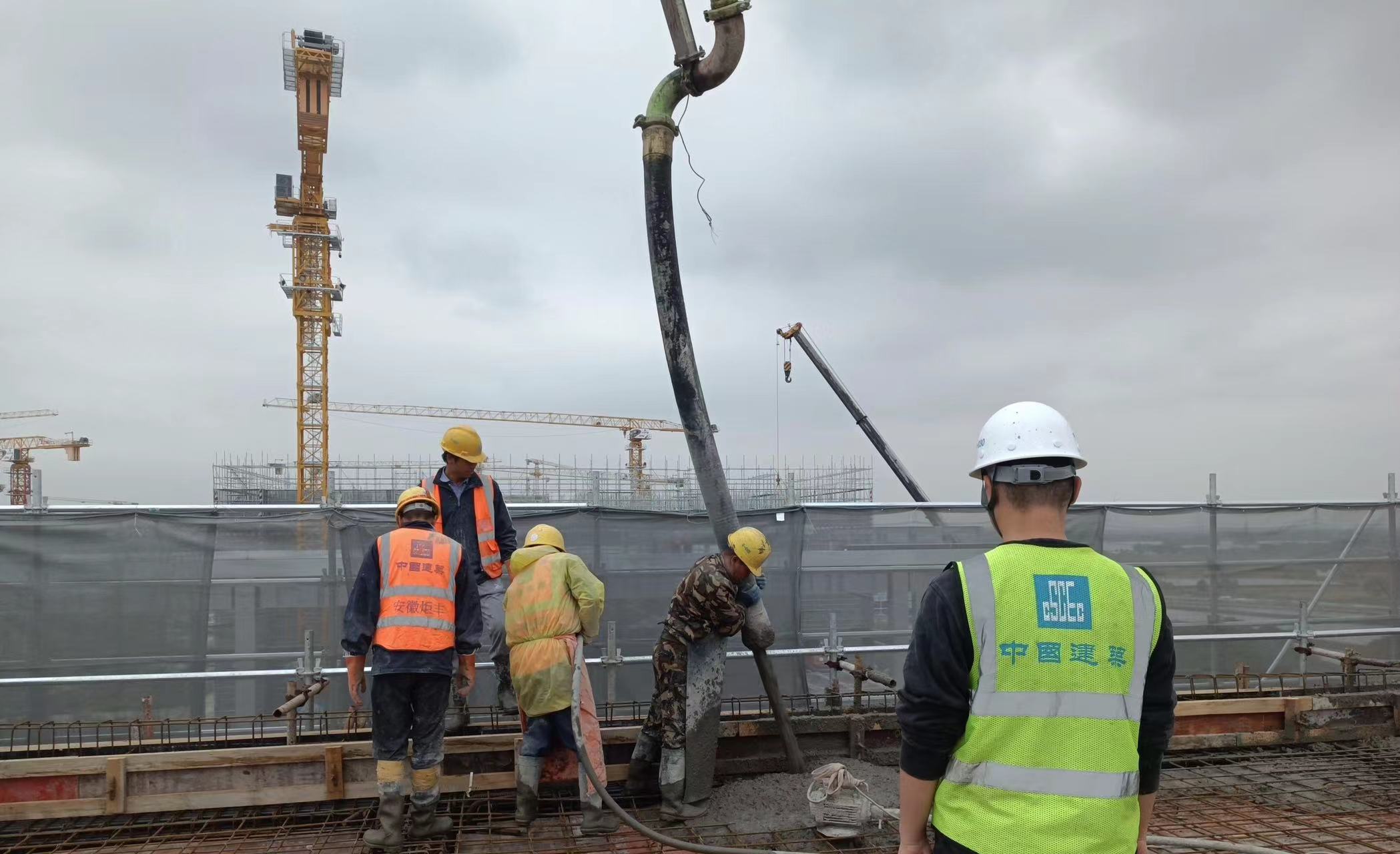 (图说:项目9#楼目前已封顶。图为工人正在浇筑混凝土。)