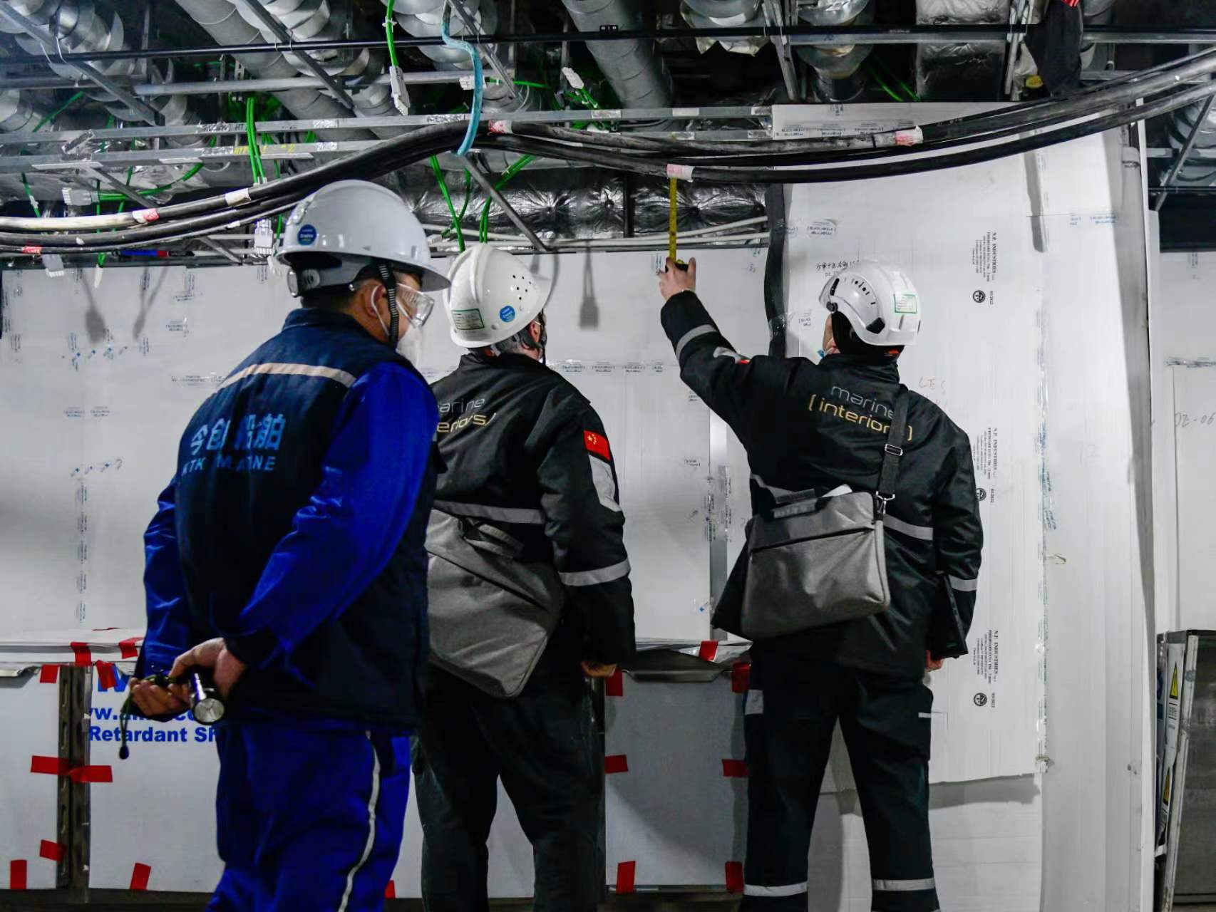 抬头看向船舱顶部,各种管线密密麻麻缠绕其上。“天花板是邮轮最难做的,因为主要的系统都在天花版上交互,需要安装状态和调试状态全部具备以后才能完成。”外高桥造船邮轮办公室主任、大型邮轮项目副经理易国伟介绍,邮轮上仅电缆就有4300公里,目前已经铺设了4200公里,接线也已完成了50%。