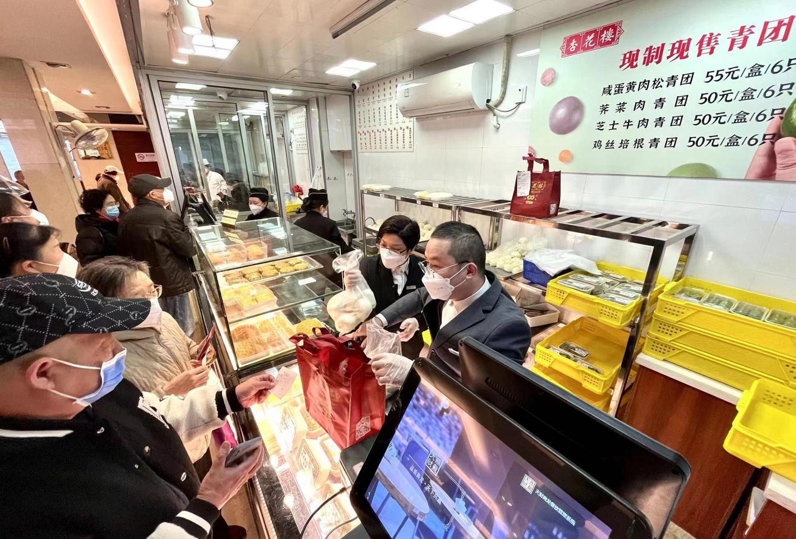 今年春天来得早,老字号青团已提前上市。各家都在推出新口味的同时,老字号杏花楼的现制现售青团已摆上柜面开始销售。由杏花楼首创的咸蛋黄肉松今年依旧是市民“顶欢喜”选购的青团产品,荠菜鲜肉、鸡丝培根、芝士牛肉也同样受追捧。