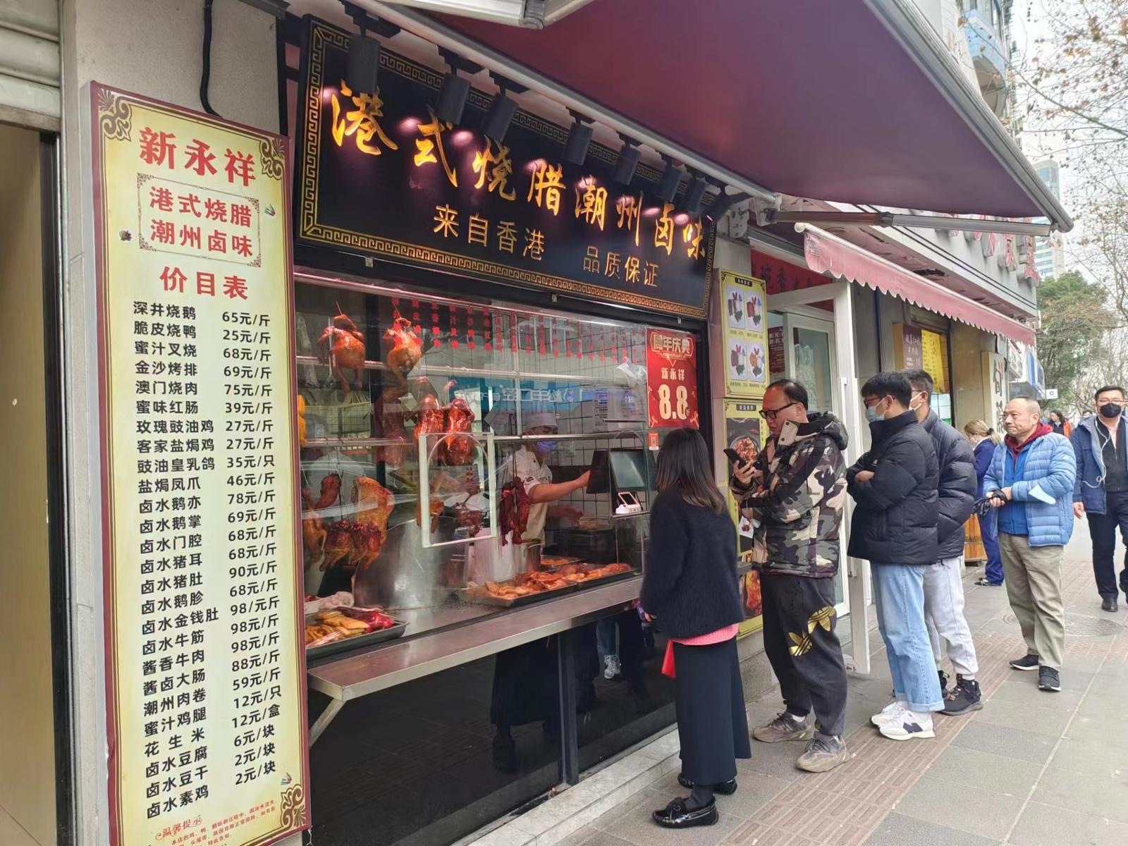 新永祥门前排起了小长队,港式烧腊、潮州卤味正在热销,不少人闻香而来。福鼎肉片、肉燕等福建特色小吃也吸引了不少行人,这家小宝路鼎记店内人气满满。一路前行,也有部分小店尚未恢复营业,部分美食小店正处于盘整期。