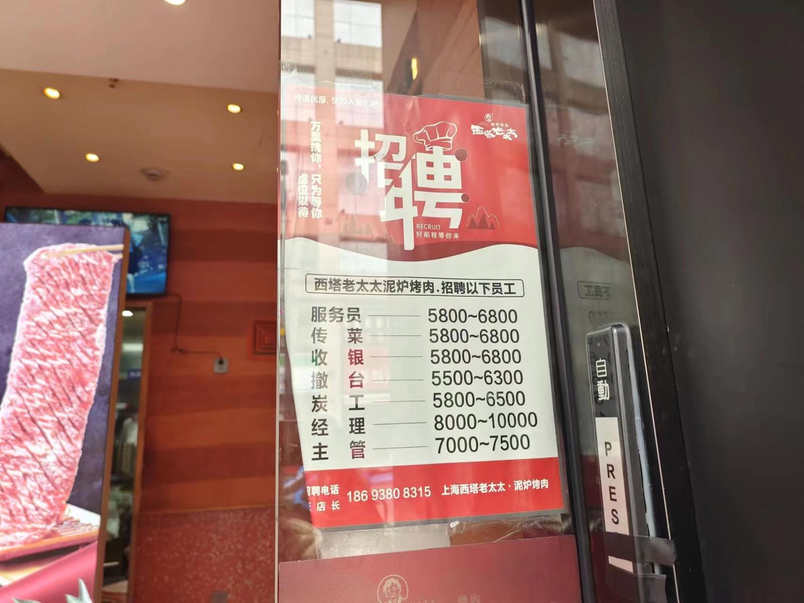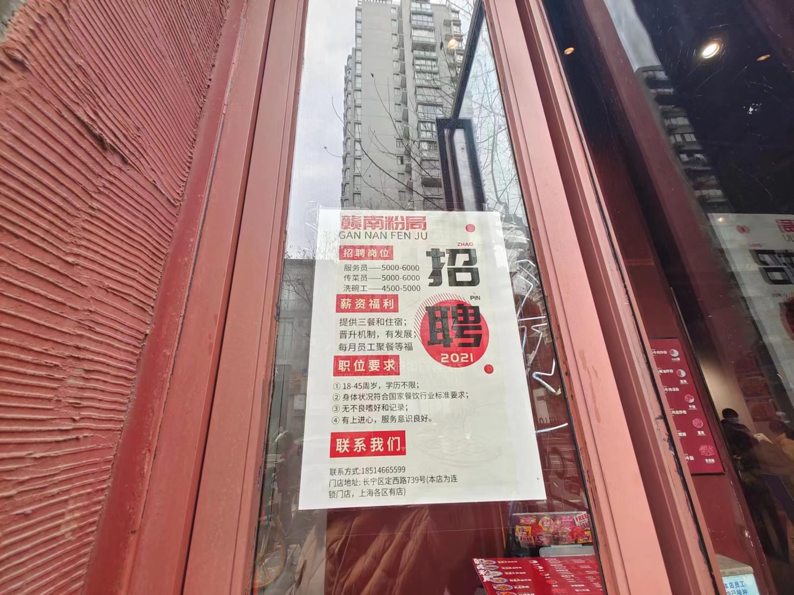 定西路上的赣南粉局招聘帖上的日期还是2021年、但依然张贴在店门玻璃上,服务员和传菜员5000至6000元,洗碗工4500至5000元,招聘待遇中薪资福利还写明“提供三餐和住宿;晋升机制,有发展;每月员工聚餐等福利”。职位要求中则表示对学历不限,年龄要求18至45周岁。