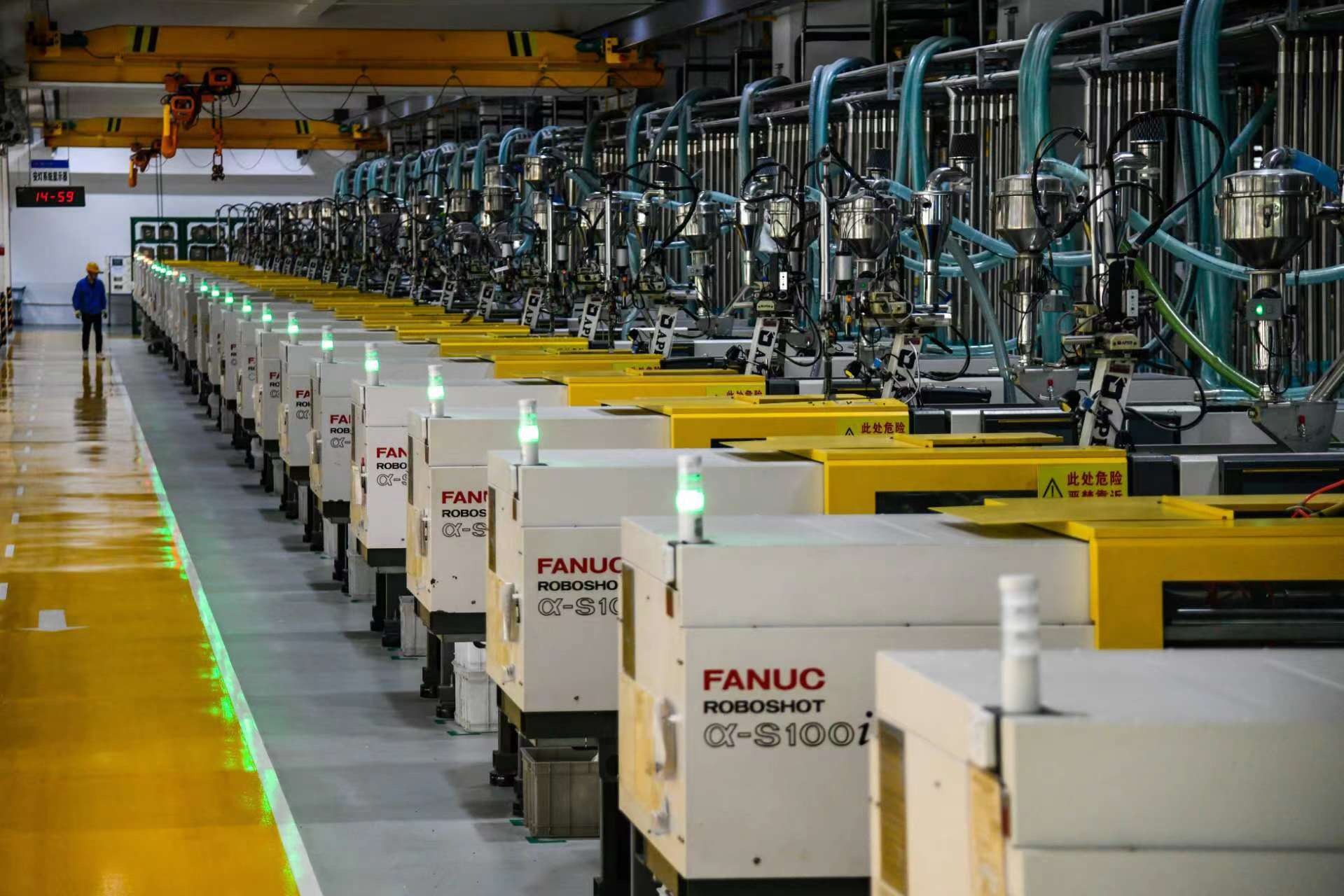 “以前注塑机供料需要工人不停地拆掉物料包装,不停地爬上2米多高的注塑机料斗投送物料,现在只要把物料一次性放进设置在地面的中央供料箱,可持续运转6个小时,缺料会自动预警,提醒工人填料。”罗俊通说,目前整个注塑车间5个工人就可操作130台注塑机,效率是传统生产的10倍。