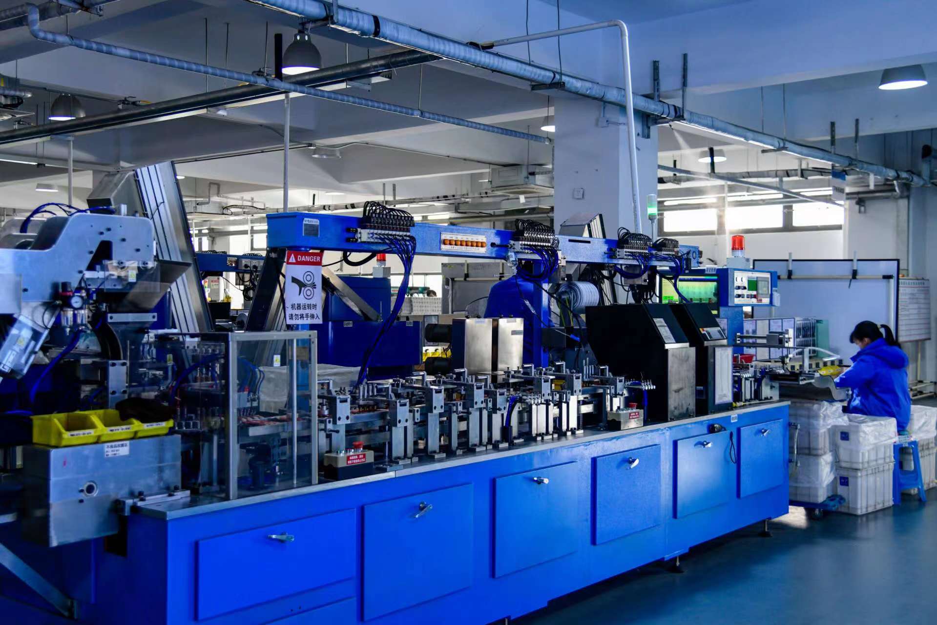 而在三楼的智能装配线车间,同样也没有看到很多工人。笔头机、笔芯机、笔夹机、贴标机、尾塞组装机、印刷机相互配合,一件件成品在快速下线。一个工人操控多台机器,一天可以生产8万支笔。