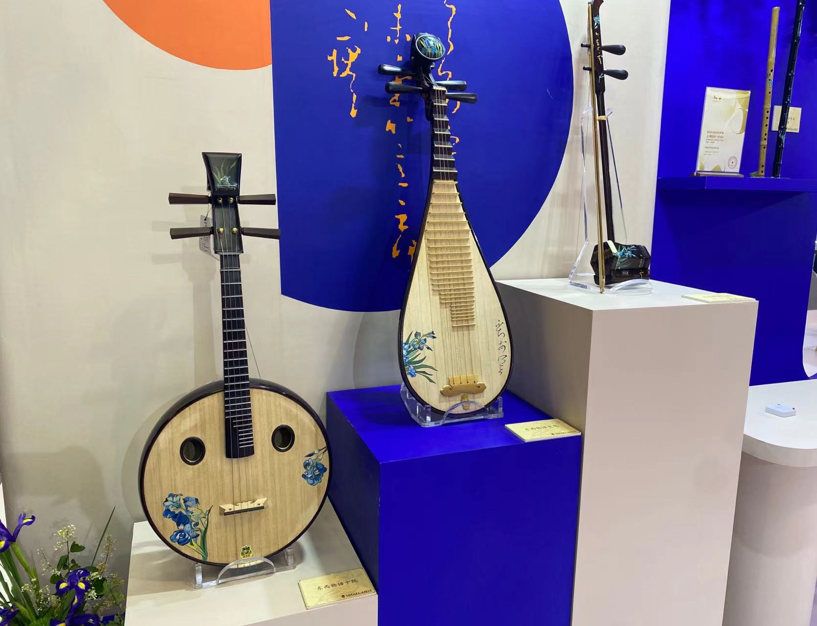步入上海民族乐器一厂有限公司展区,一样样极具古典韵味的传统乐器映入眼帘:被作为国礼赠送给泰国甘拉雅尼·瓦塔娜音乐学院的二十四节气·秋分古筝,与美国大都会博物馆和上海博物馆联名合作的古筝、二胡、琵琶、月琴、笛箫、中阮,上海工艺美术大师翁纪军用大漆工艺雕琢的限量版“锦绣山河”系列乐器……
