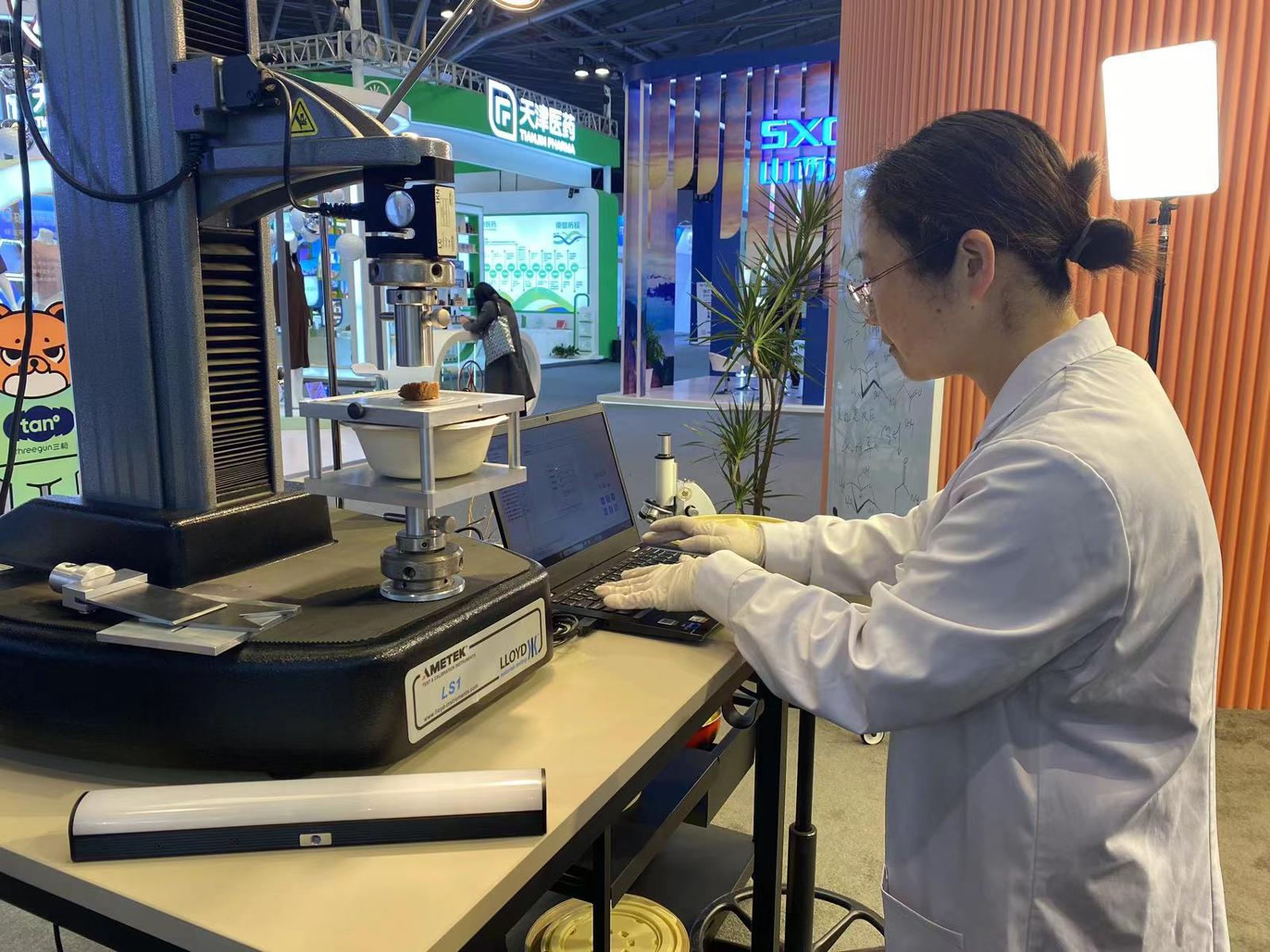 豫园文化饮食集团科创中心总经理刘勇告诉笔者,展区内的分析仪器是“预制食品质构分析仪”,专门用于检测分析各类食品的酥烂、脆度、弹性等特质,通过精准的分析研究保障预制菜产品的口感与质量,尽可能还原非遗技艺及老字号品牌菜品。同时,科创中心还采用“智能感官电子舌”对菜品甜味、鲜味、咸味等各个维度进行测试,只有预制菜和堂食的风味图谱重叠程度达到 90% 以上,产品才会被推向市场。