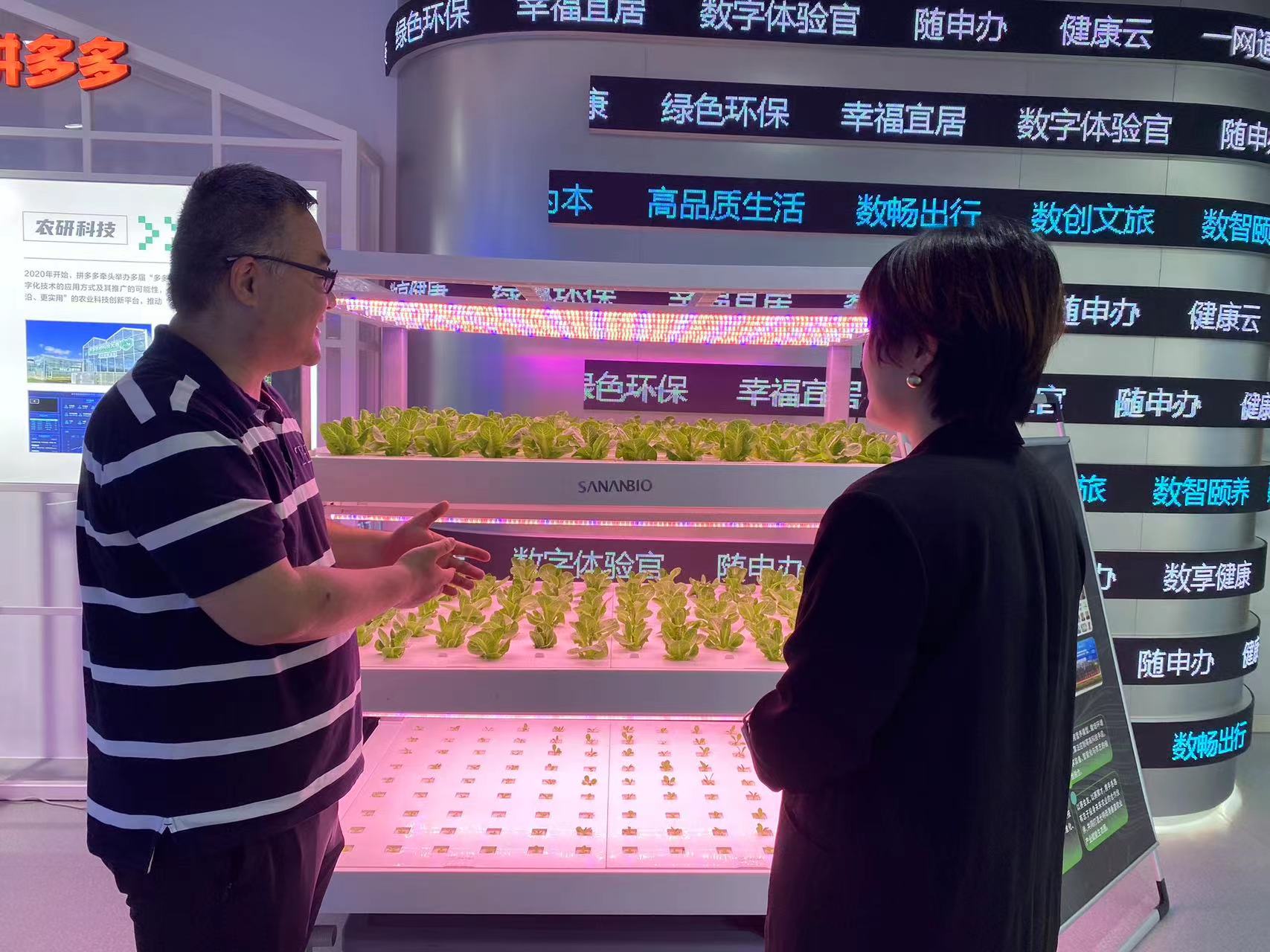 在上海城市数字化转型体验馆中,笔者还看到了一个小型的生菜“生产车间”。据介绍,这是从上海崇明光明母港垂直农业研究中心搬来的光明多多垂直农业挑战赛用的智慧种植装置,在这个装置中,种植架被划分为三层,每层都装有种植托盘;托盘中的营养液通过管道与控制台相连,可以长期保持设定的浓度;作物将在人工定制的光与液中,按照计划生长。