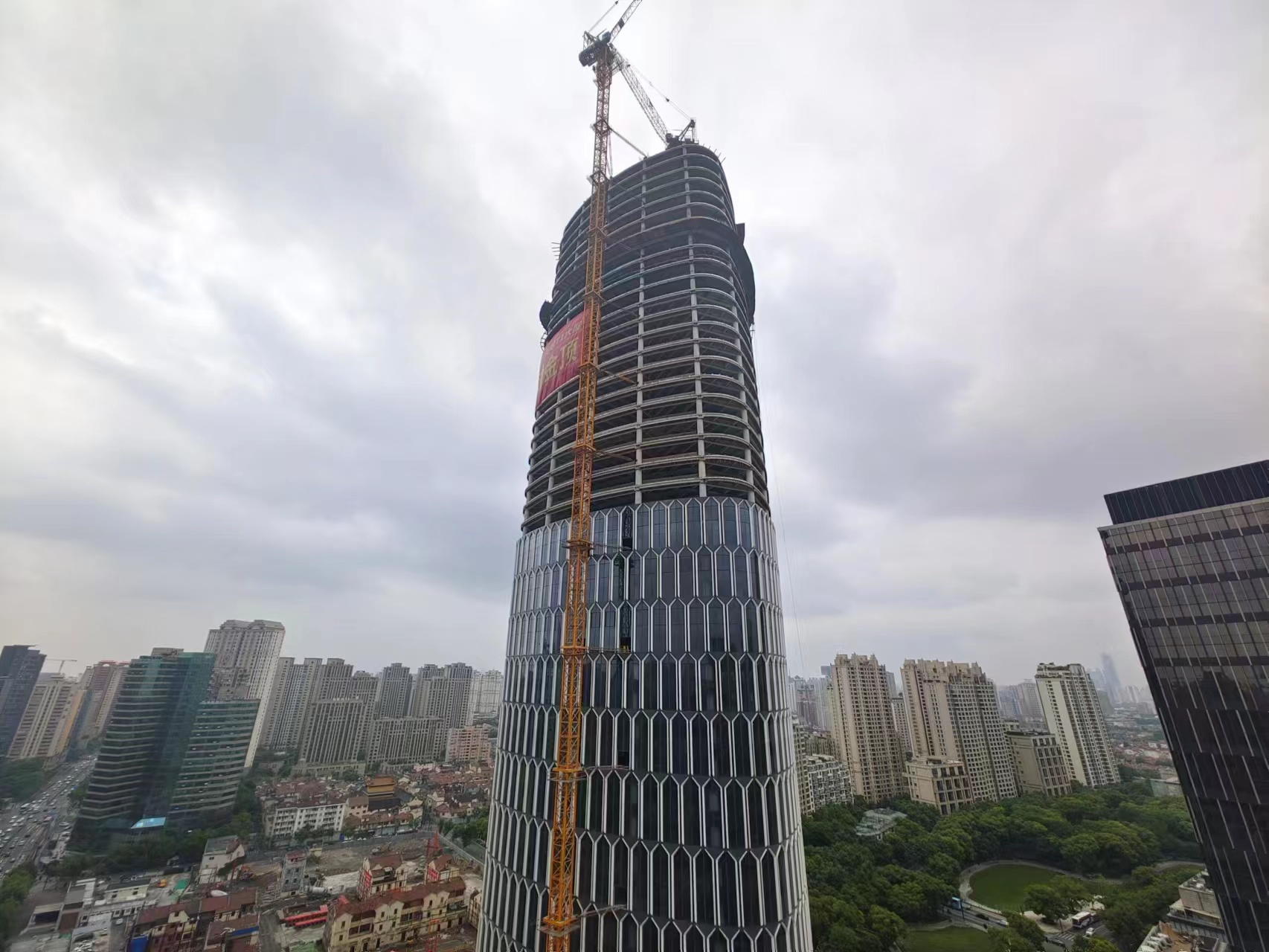 太平洋新天地T1大厦喜封金顶。劳动报记者陆燕婷 摄影