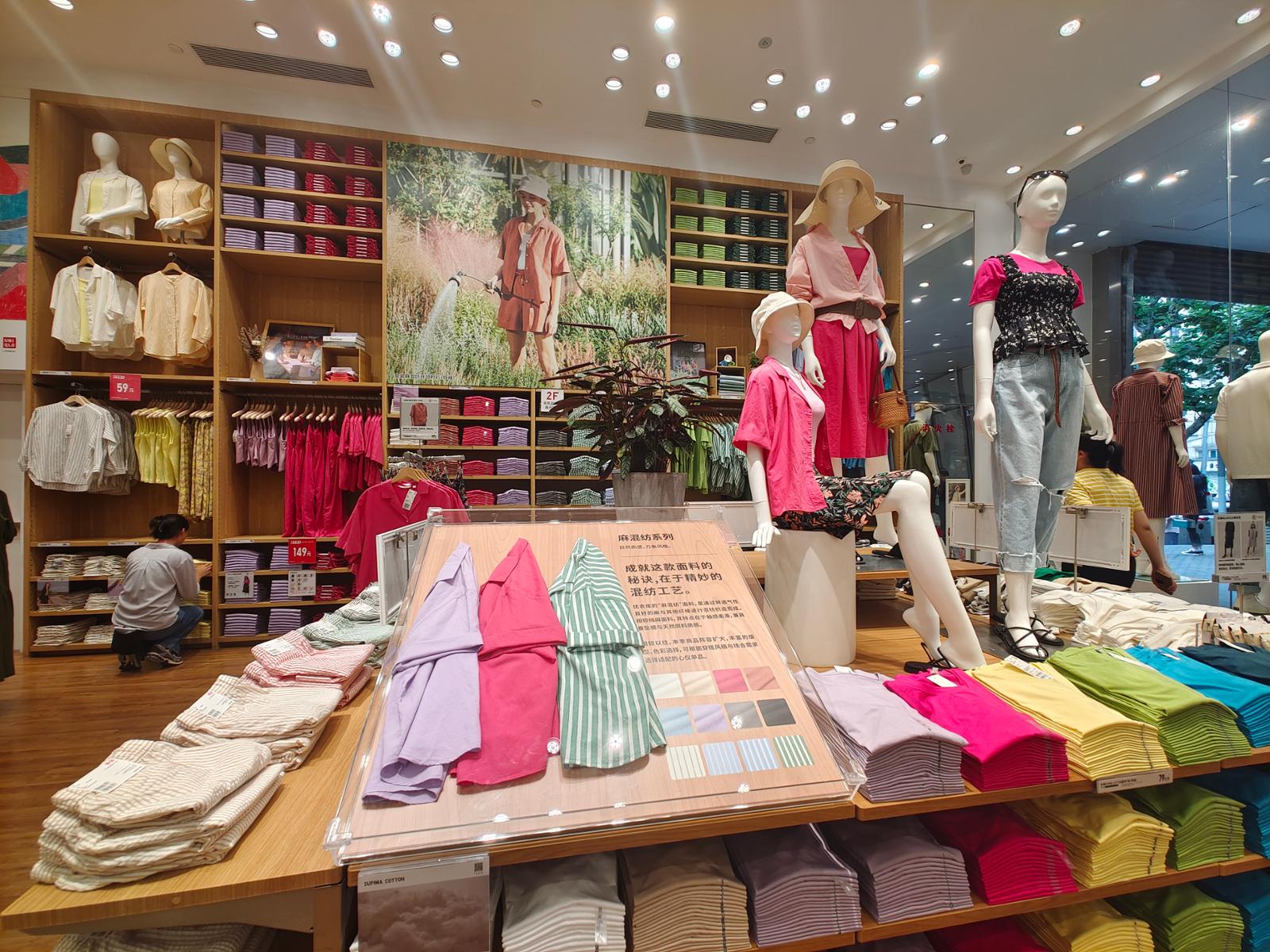 而在品牌店里,除了讲究款式上的点睛,也有许多消费者讲求面料。酷暑之下,速干的运动衣非常受追捧。优衣库南京西路全球旗舰店里,大量的平价夏季新款上新,诸如火影忍者、龙珠等合作款夏装在夏日陆续上新,也有不少衣裤打出了“面料牌”。