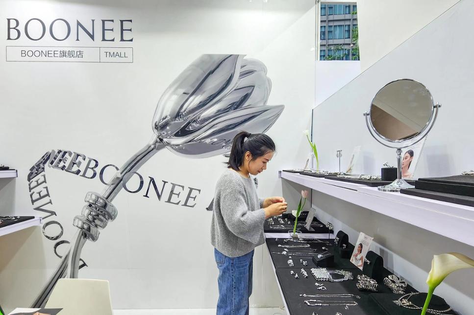 “时装周不单单是服装展示,饰品也很重要。尽管是平价饰品,也要以珠宝级的工艺来制作。”在BOONEE品牌展位上,吸引了大量的观展者。BOONEE创始人汤胡彪透露,在线上平台销售已有多年,主打高品质的平价饰品,通过设计和制作工艺来带火展品,将原创饰品推向潮流平台。