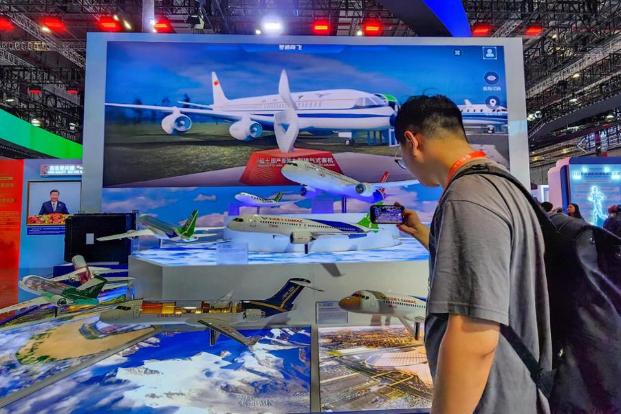中国商飞的展台前,已进入详细设计的新机型C929被安排在了“C位”。据展台工作人员介绍,C919相比老款的同类机型能够降低碳排放12%至15%,而C929则提出更高的设计目标,它的设计主要采用低油耗、低噪声、低排放的绿色设计理念,要降低碳排放60%。