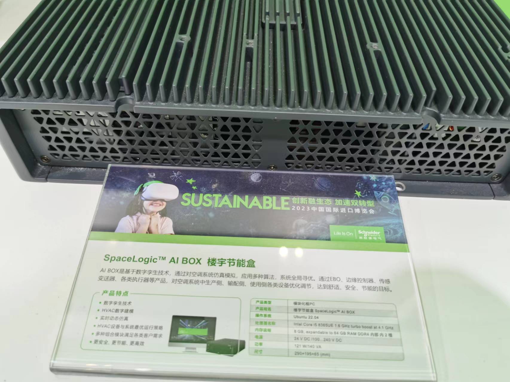 而今年的展会中,施耐德电气就带来了一款“楼宇节能盒”,别看这个展品体积并不大,但却通过数字孪生建模和仿真调试获取系统特征,实时调整暖风系统模型精度,提前预测系统能耗,提高系统运行效率。这种AI技术给出的“最优解”,无疑可以助力建筑节能减排、降本增效。