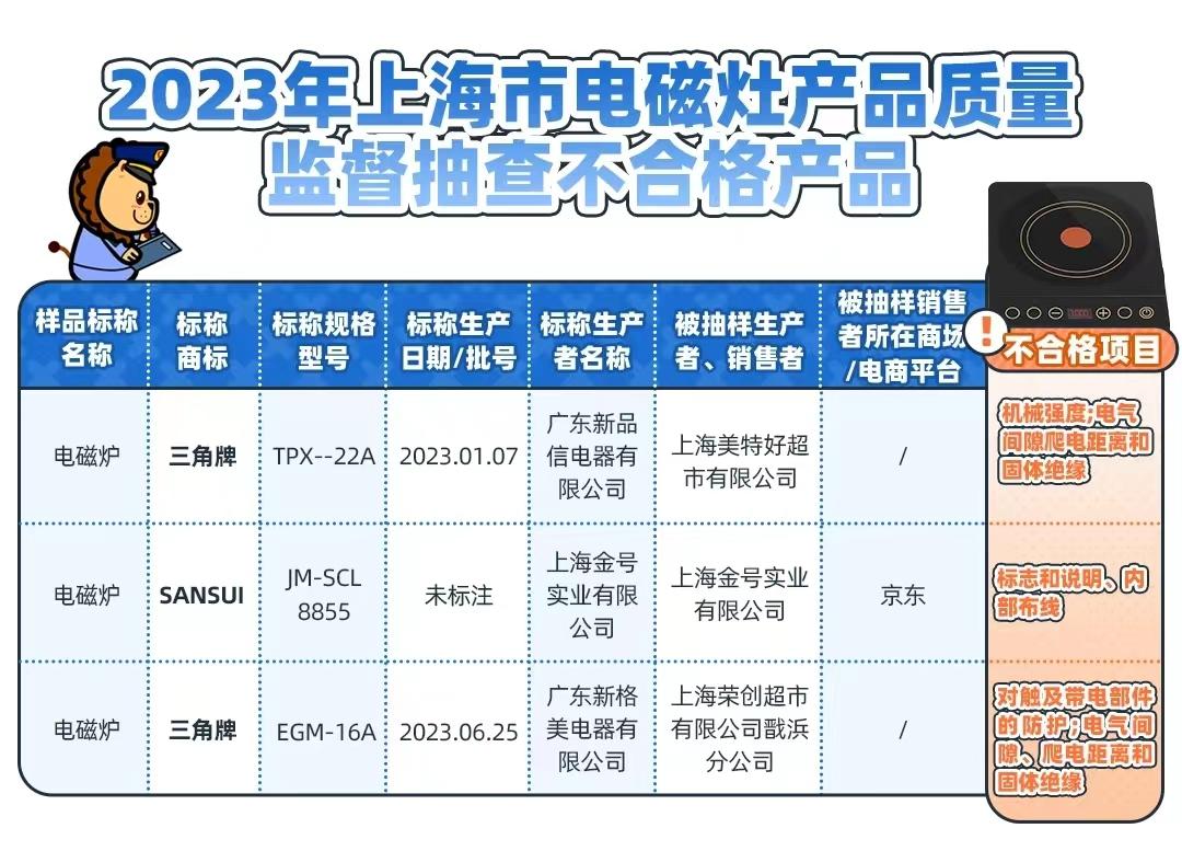电磁灶产品质量监督抽查不合格产品。上海市市场监管局图