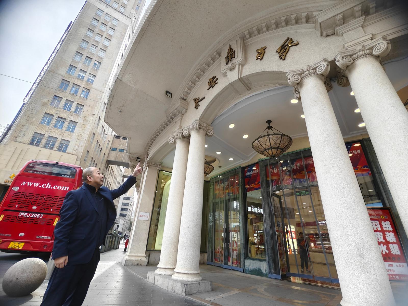 老职工孙励站在永安百货门前。劳动报记者陆燕婷 摄影
