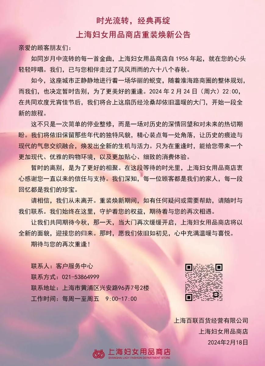 上海妇女用品商店发布重装焕新公告。百联上海妇女用品商店图