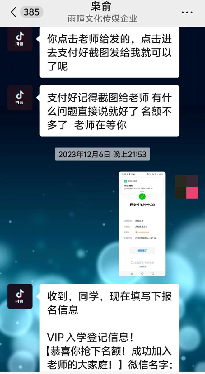 课后,“王老师”表示希望安女士能抓住这次机会,让她添加了另一位负责报名的老师微信。安女士为了想快点提升自己视频的流量,像试听课中所说的那样挣到钱,于是咬咬牙通过“报名老师”发来的企业收款码,支付了2999元学费。