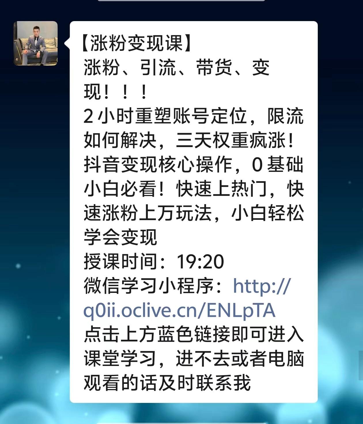 在她的极力引荐下,安女士又和一名“抖音指导王老师”互加了微信,他自称“擅长抖音内容规划、账号分析定位、涨粉带货”,并要求安女士发送她的抖音主页截图帮其进行初步分析。然后,这位“王老师”又“贴心”地为她预约了免费的培训教学课,通过微信学习小程序链接试听“涨粉变现课”。