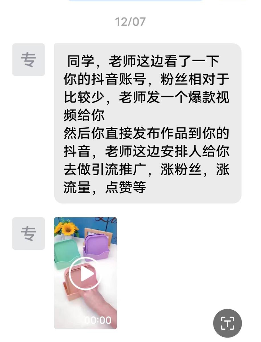 “交了钱后,App里的‘老师’在软件里发来两个商品视频,让我去掉水印后把视频和介绍发到自己的抖音上,承诺说安排人给我做引流推广涨粉丝,我照做后,粉丝流量也没变多,也没有收益。”安女士对记者说。