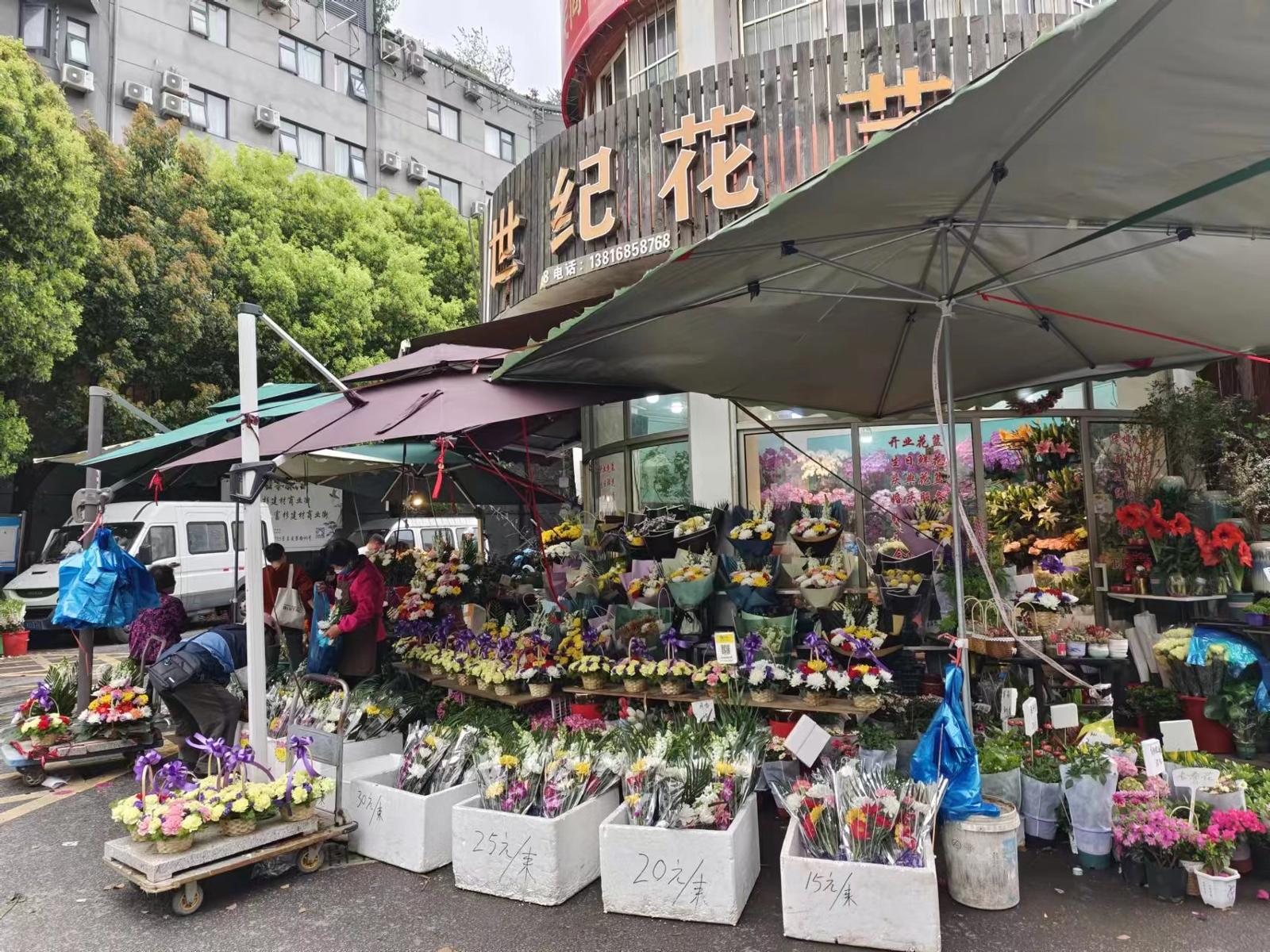 大量鲜花花束整齐摆放在不同摊位前。劳动报记者陆燕婷 摄影