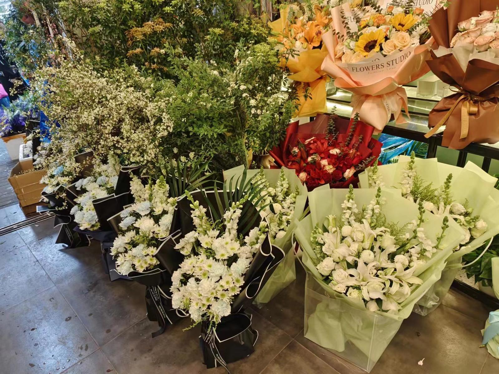 现场,还有不少花束和花篮在售,零售价从几十元到上百元不等。“花束根据鲜花选材不同,价格不同。例如将白百合、白玫瑰和白色乒乓菊进行组合花束,单束的价格在150元左右,而如果改为由白色菊花和白色康乃馨组合,则单束价格仅在70元左右。小花篮的价格一般15元、25元左右。”