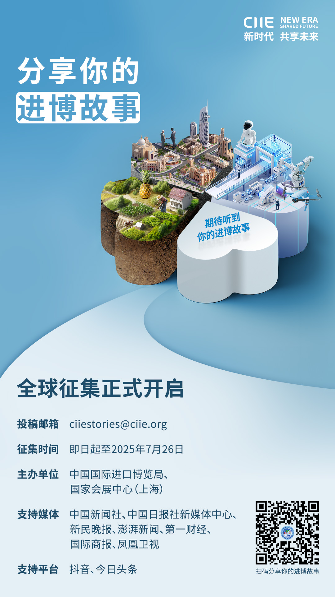 本次征集面向全球,提供与进博会相关的真实故事线索。接受境内外投稿,征文语种为中文、英文,投稿可通过官方邮箱ciiestories@ciie.org或官方网站首页。