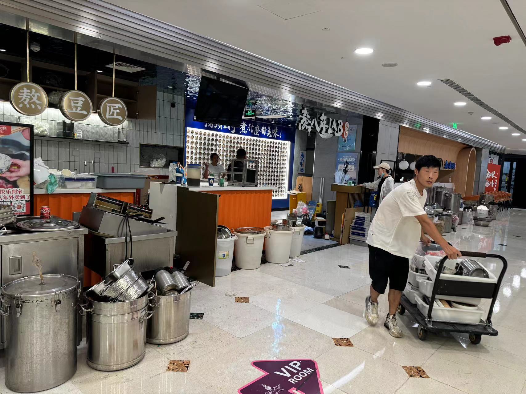 走入歇业前最后一天的梅龙镇广场,可以看到大半店铺已经关门、搬空。部分店铺里堆满打包用的纸箱,几家餐饮店将锅碗瓢盆摆在店外,有工作人员用小推车将它们一车车推走。