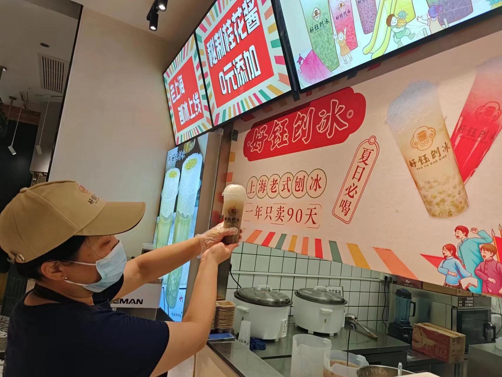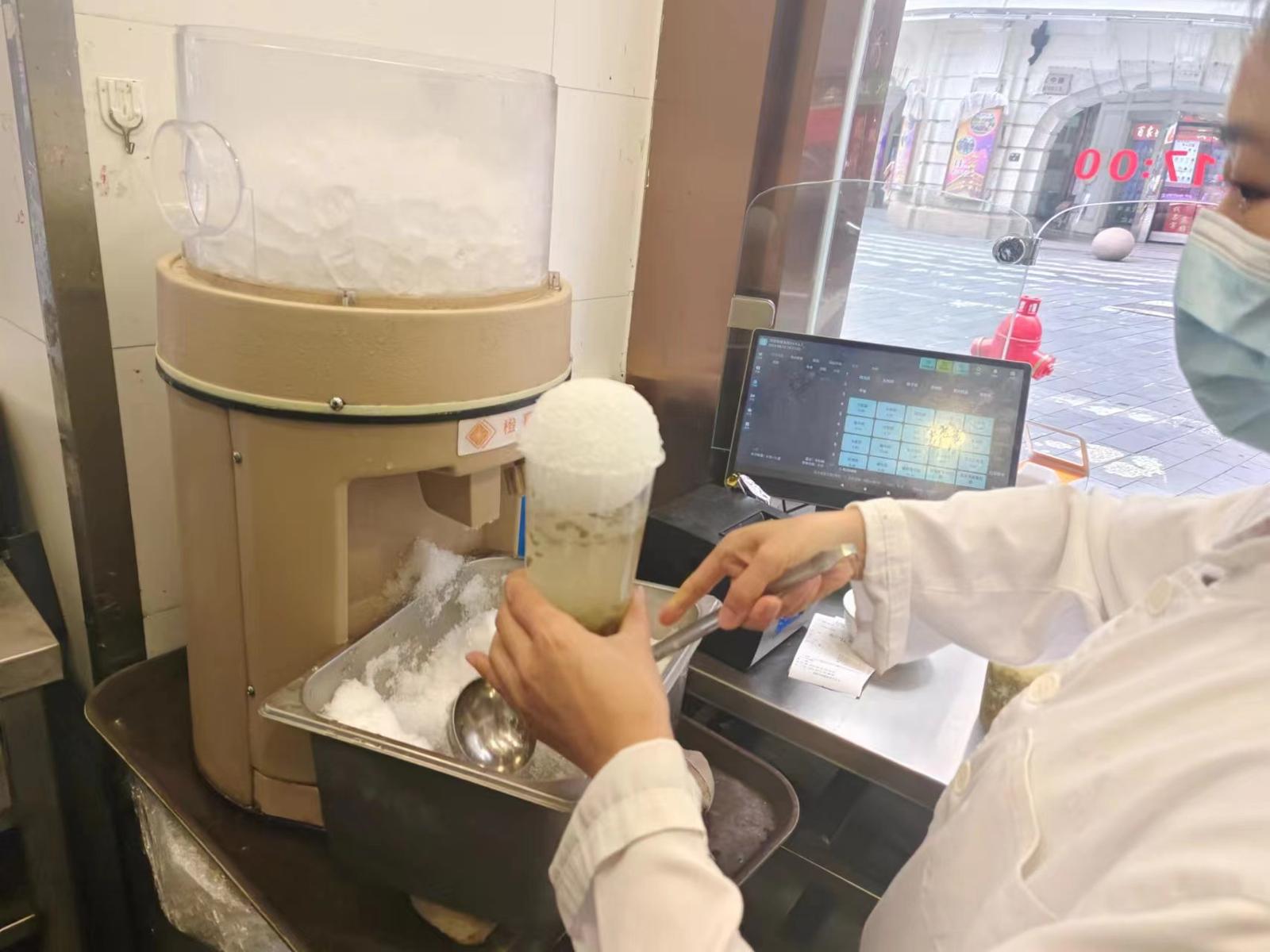 沈大成南京路店,现场快速制作刨冰。劳动报记者陆燕婷 摄影