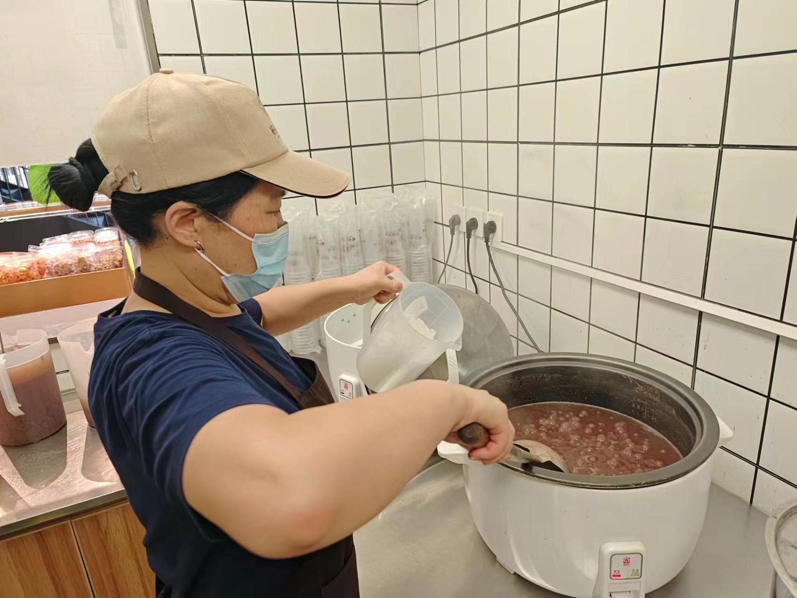 熬煮红豆,添加冰糖。劳动报记者陆燕婷 摄影