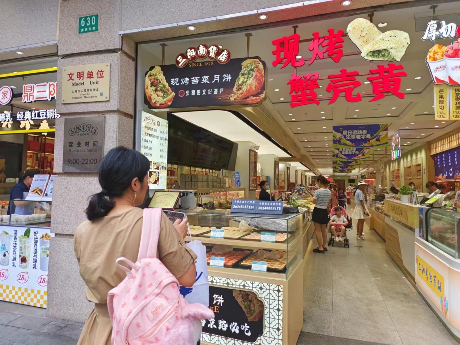 食客购买苔菜月饼,并拍照打卡。劳动报记者陆燕婷 摄影