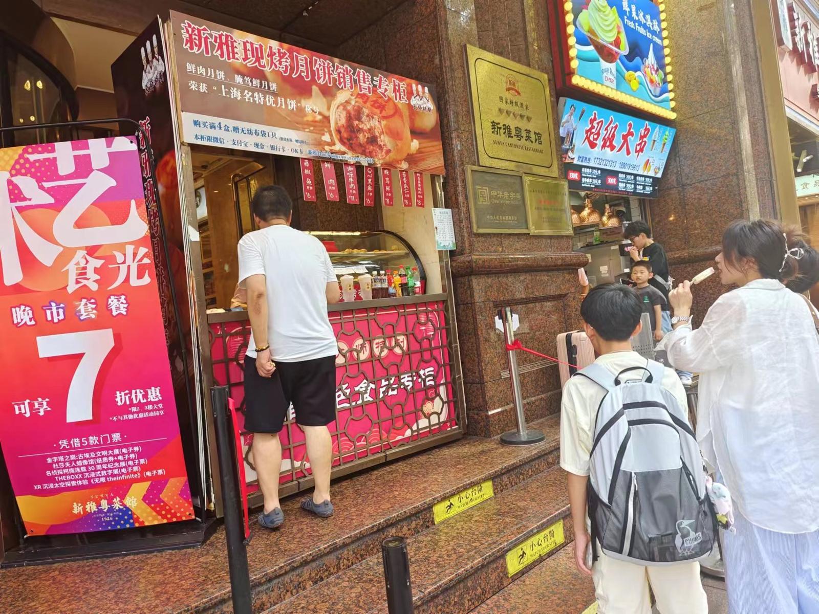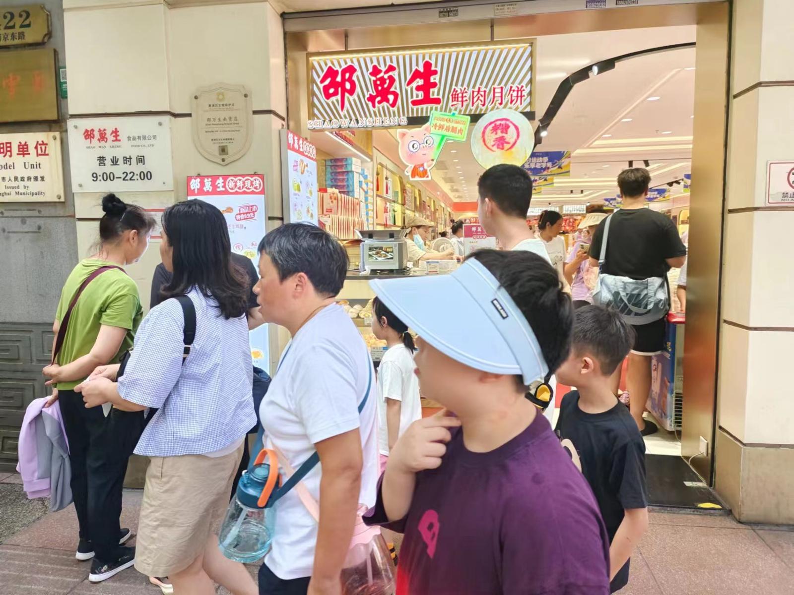 南京路步行街上,月饼销售更是多品牌、多品类。新雅粤菜馆门前,现烤鲜肉月饼已开始热销,也有不少市民游客驻足停留纷纷购买。对面的第一食品门前,龙华净素月饼开售,排队客不少。第一食品门店内,杏花楼、功德林等各大品牌的月饼礼盒都已摆上货柜,进入旺销期。沈大成、三阳南货店、邵万生、真老大房、泰康等老字号月饼也都有不少食客购买,客流量明显增多。