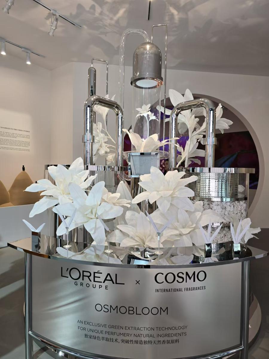走进欧莱雅展台上的“香氛的艺术与科学”展览,仿佛置身于一片花田中,晚香玉的香气先于展台上被花朵环绕的萃取设备进入大脑。“在鲜花盛开的时候,我们把机器放到花田中,采摘最新鲜的花朵,通过OSMOBLOOM香原料提取技术,获得最纯粹的花香。”展台工作人员介绍,通过该技术,无需加热、冷却,不耗水,能耗低,就能获得与“田野中的鲜花气味一模一样”的香气。