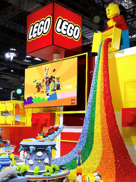 一走进乐高展台,迎面而来的是一条斑斓瀑布。在这一主题装置中,位于顶部的乐高小人仔将黄色礼物盒里的积木颗粒倾泻而出,形成了一条彩色“玩乐瀑布”。随着玩乐瀑布上积木的流淌,3大主题沙盘在装置底部汇聚而成,象征着每一位儿童在玩乐中发挥创造力和想象力,释放超能力,最终抵达理想的目的地。