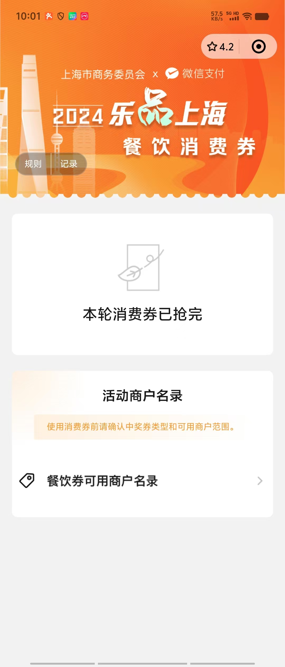 10点01分,微信平台上“乐品上海”餐饮消费券已抢完。受访对象提供手机截图